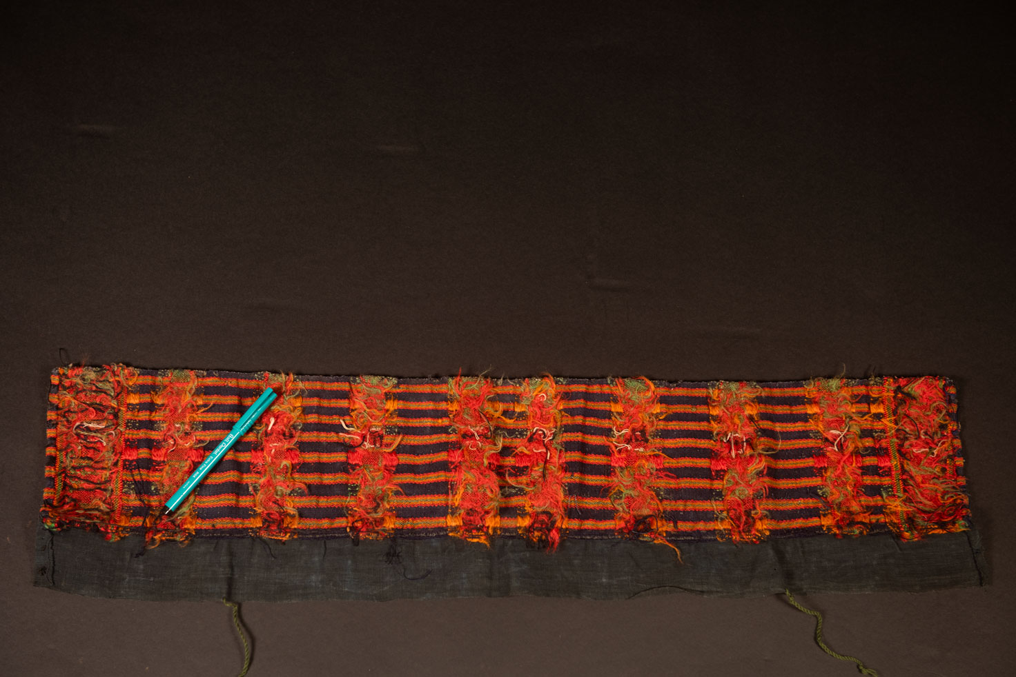 在排灣族中,喪服是最具代表性的織品之一,也在文化中佔有極為重要的地位。由於排灣族對死亡與哀悼的觀念極為嚴肅,這類服飾在其儀式中扮演著核心角色。其中一項顯著的服飾為女性所戴的三角形或四角形帽子。穿戴者會先以頭巾包覆頭髮,然後再將喪布覆蓋其上,並使用兩條繫帶在頭後綁緊,使布料自然垂落於兩側。喪用披肩則穿戴於日常服裝之上,披於雙肩,並以兩條繩帶緊束於胸前。 在排灣社會中,喪服上的圖案象徵穿戴者的社會階級。貴族成員所戴的喪帽與披肩色彩鮮豔、圖案繁複;而平民百姓則穿戴無裝飾的素色款式。此類服飾僅於喪期或葬禮中穿著,其圖案與日常服飾迥然不同,兩者不得混用。此外,喪服及喪帽等物品不得作為禮品贈送。一旦這些物品磨損,會被改作護腿之用;若無法再使用,則會一同埋葬於墓中。根據排灣傳統,若這些喪用品被不當處理,將招致厄運,甚至連女祭司也無法逆轉。 這些喪服傳統上以苧麻為主要原料編織,作為基礎與經線,並常以天然靛藍染色。緯線可能也由苧麻製成,或使用天然羊毛與壓克力等其他材料,在提花技巧中經常運用。使用錦織技術製作的圖案極為精緻美觀,呈現出刺繡般的效果,因此也被稱為「鑲嵌織法」。以此技法呈現的人臉或人形圖案非常常見。