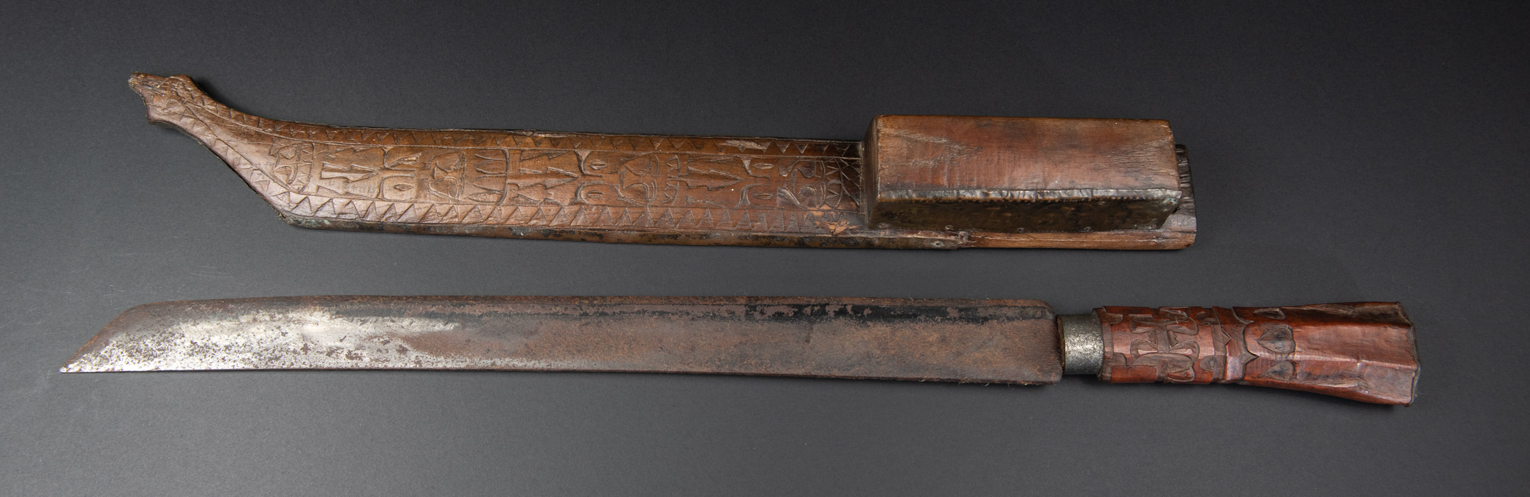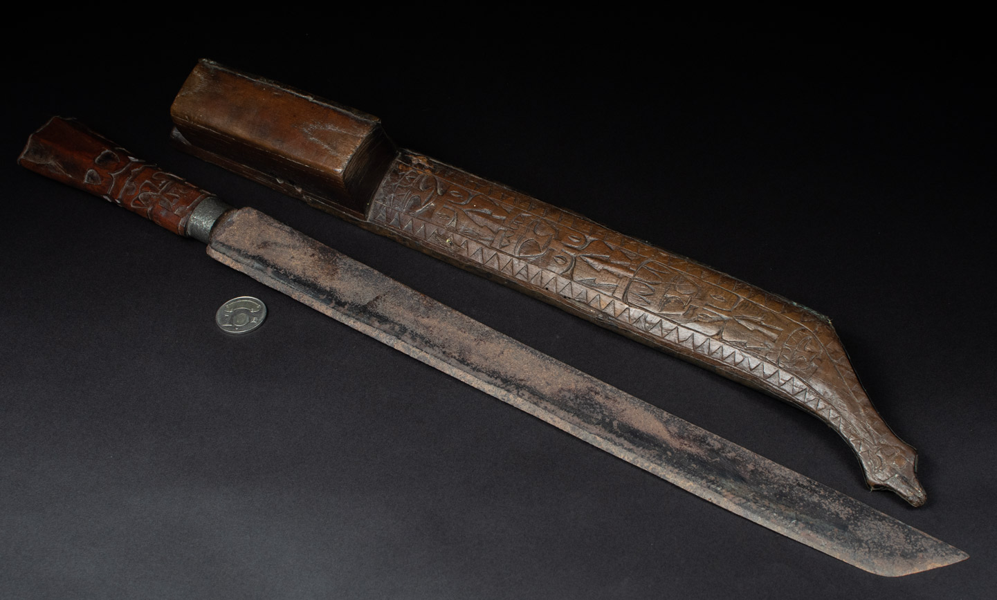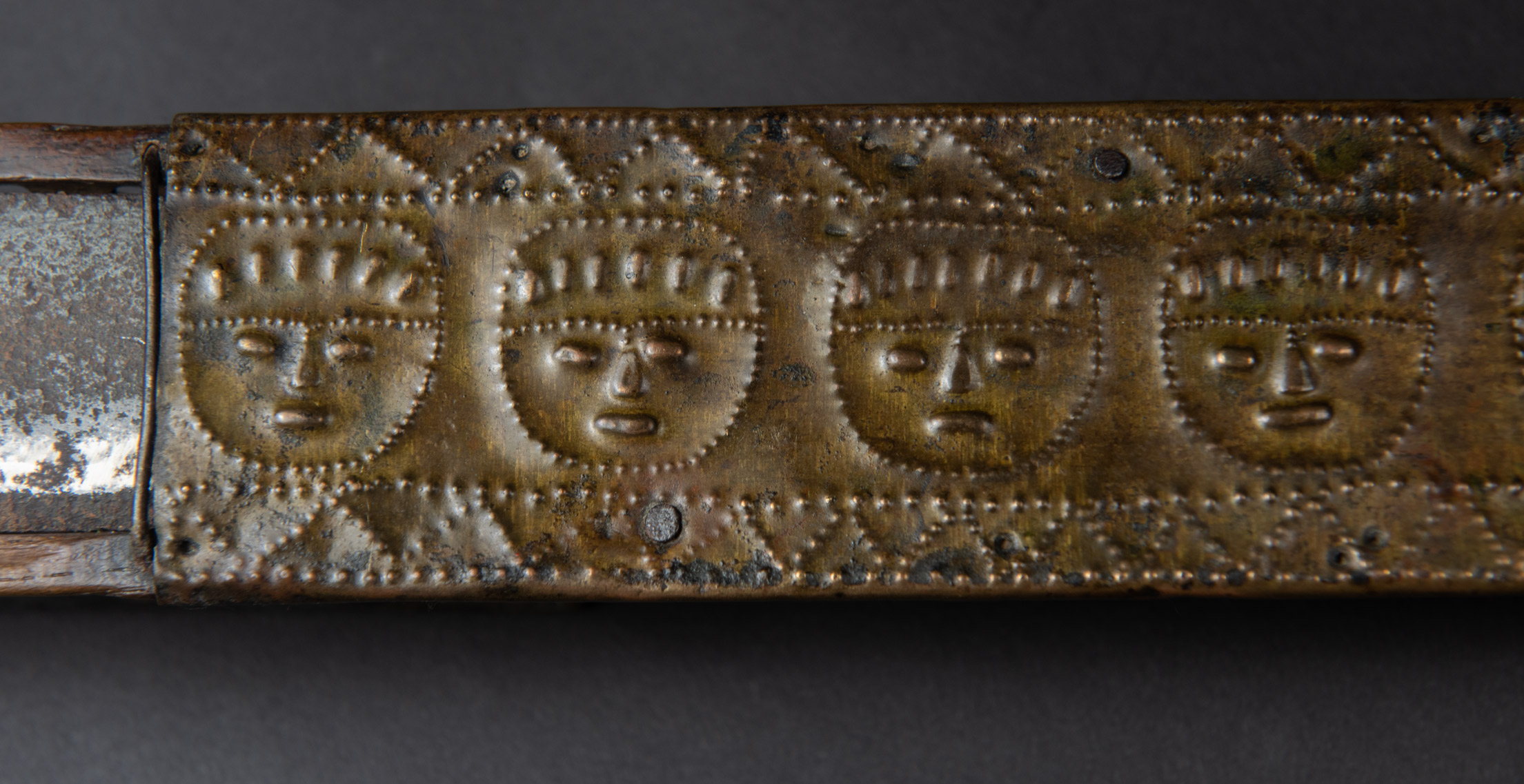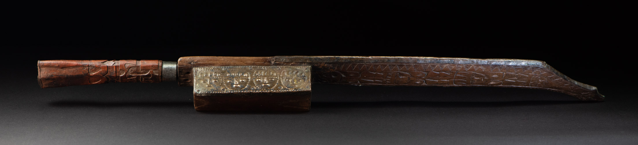 這把來自排灣族的巨劍,正面與側面鑲有浮雕黃銅,雕刻著人臉,背面則以純正的排灣風格雕刻了三個文字。