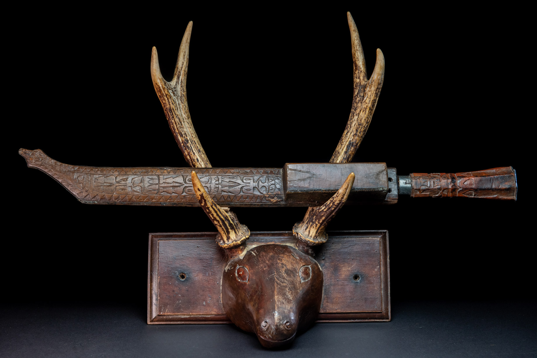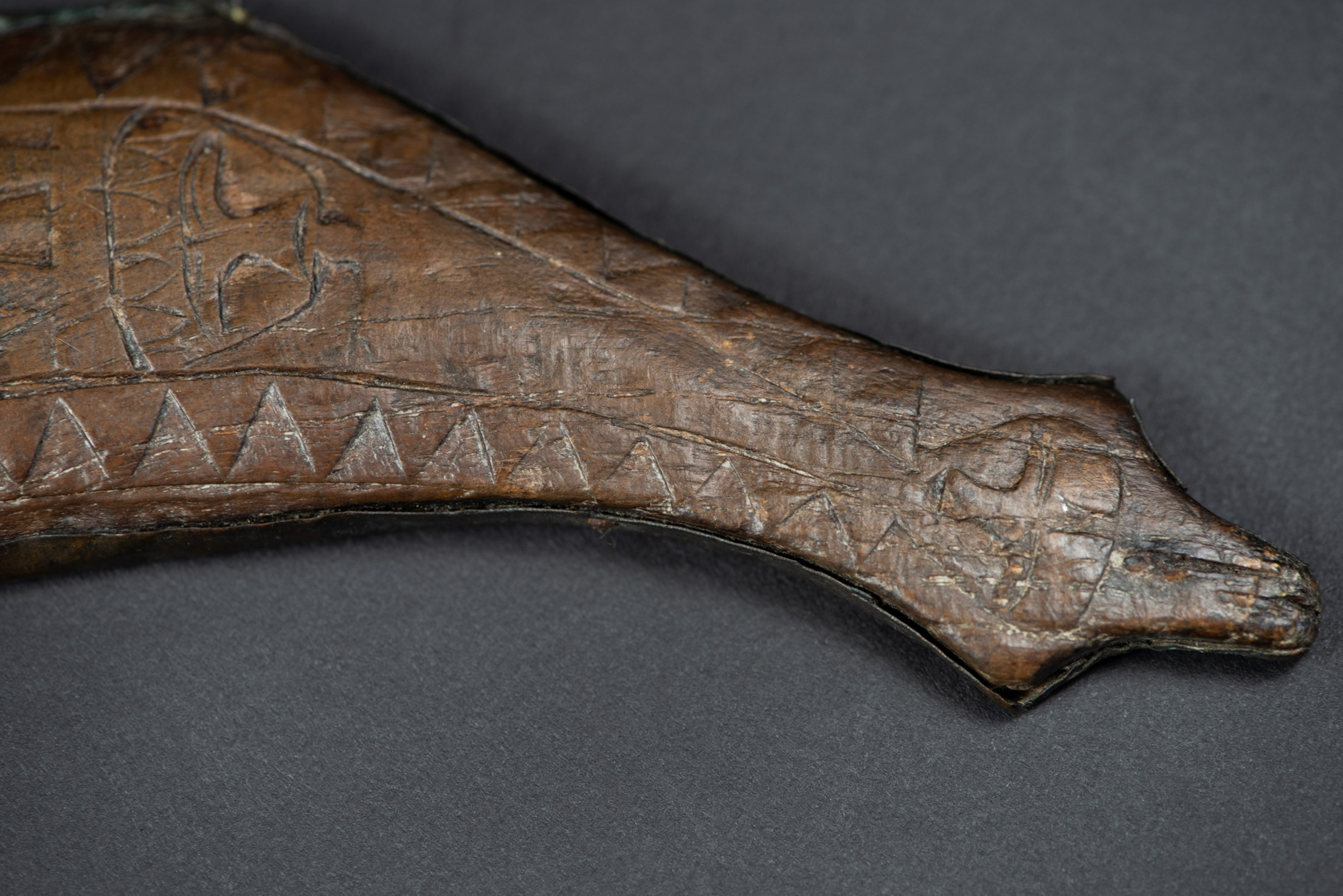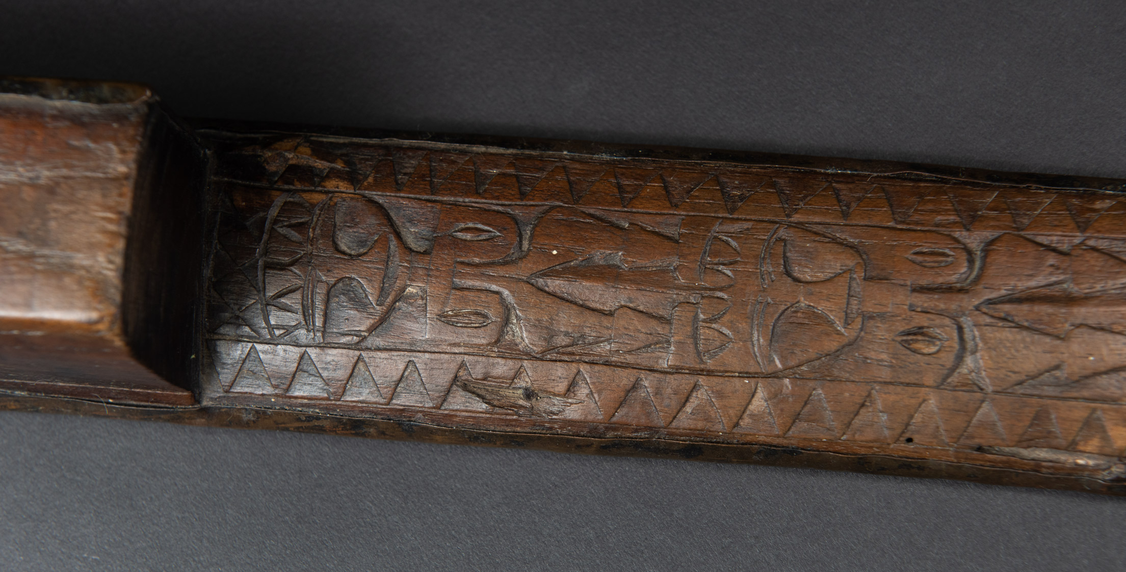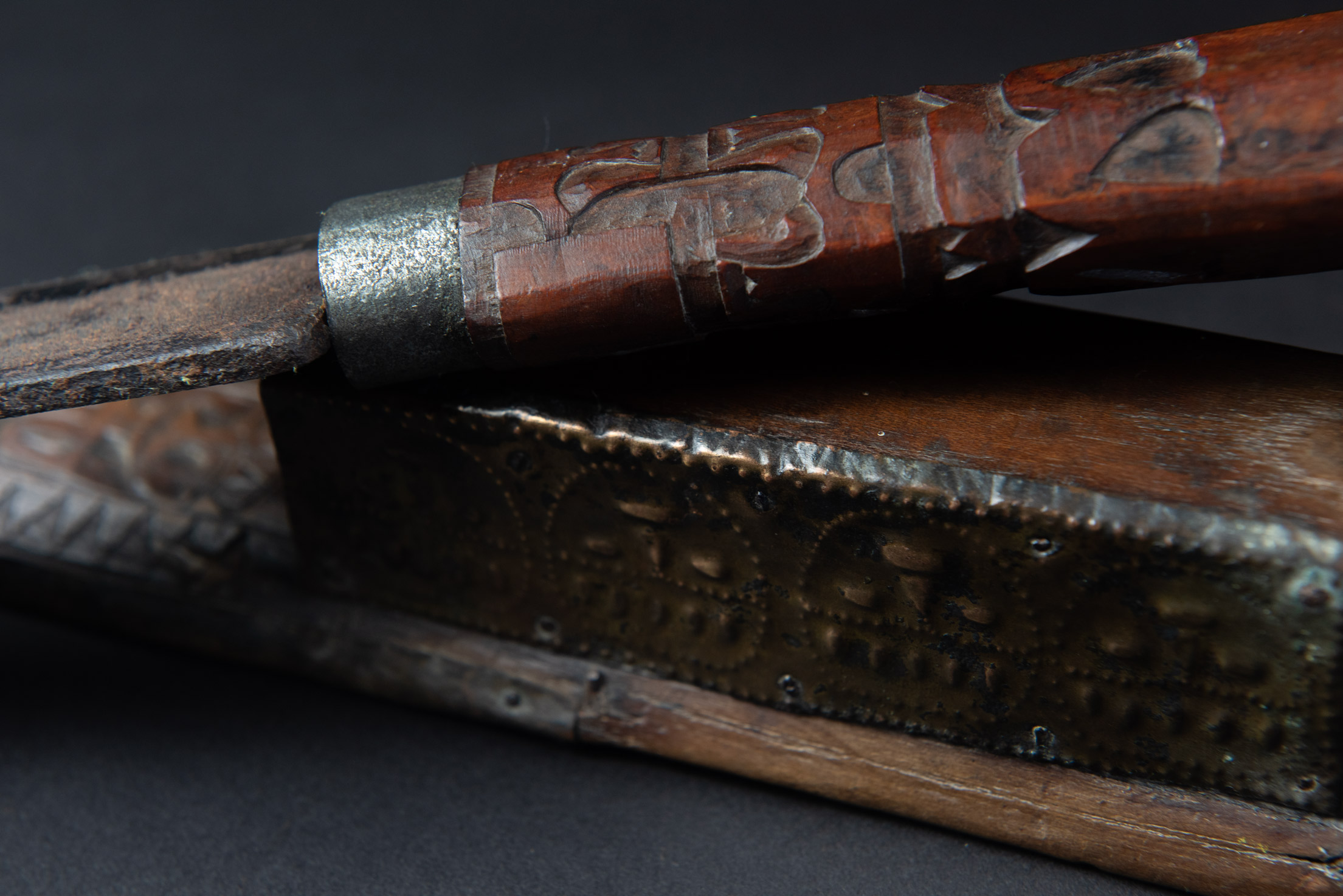 這把來自排灣族的巨劍,正面與側面鑲有浮雕黃銅,雕刻著人臉,背面則以純正的排灣風格雕刻了三個文字。