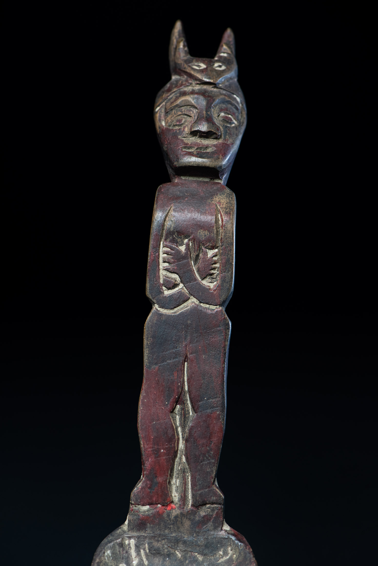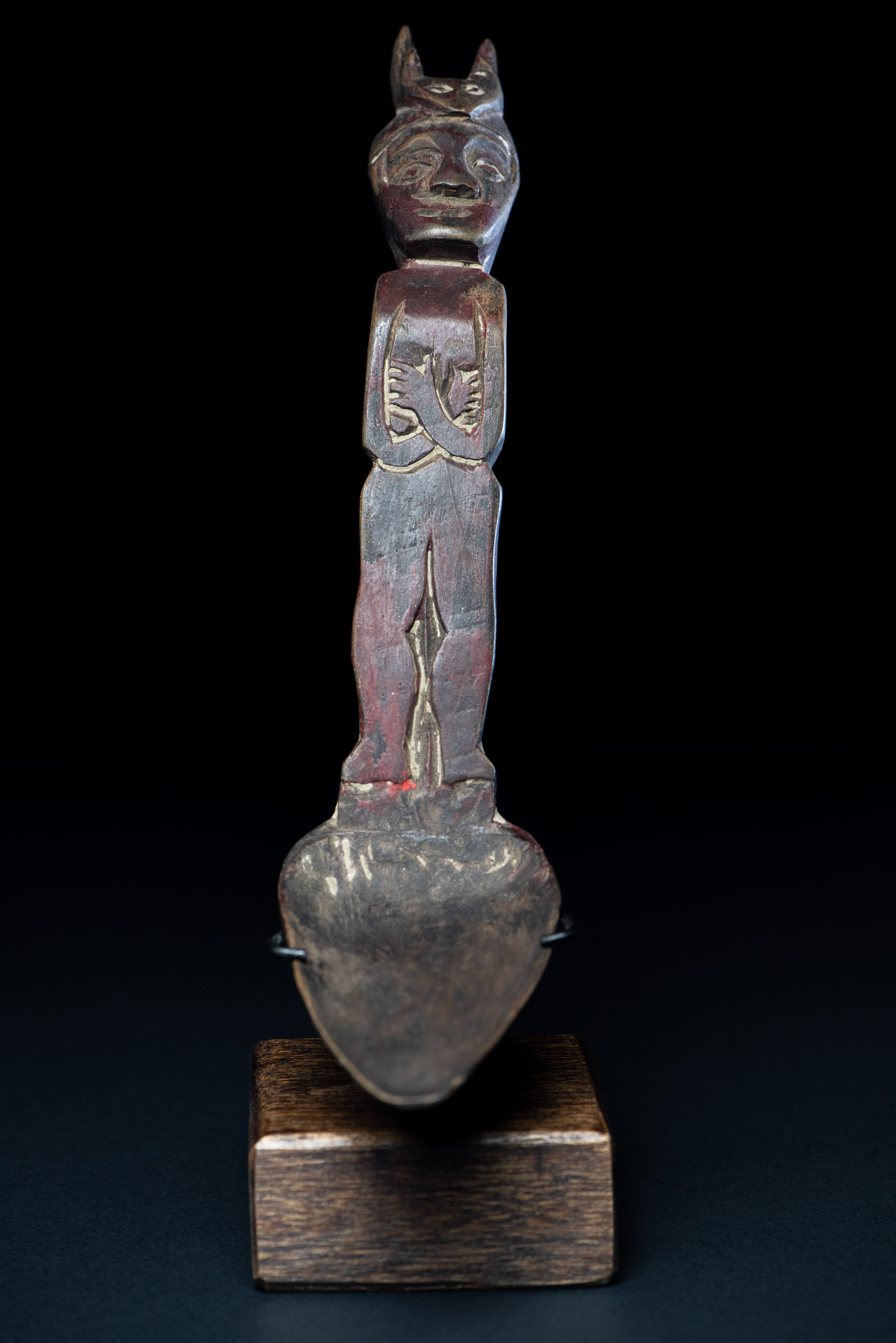 排灣族古老湯匙,染有紅色顏料,雕刻戴有儀式頭飾的祖先形象。