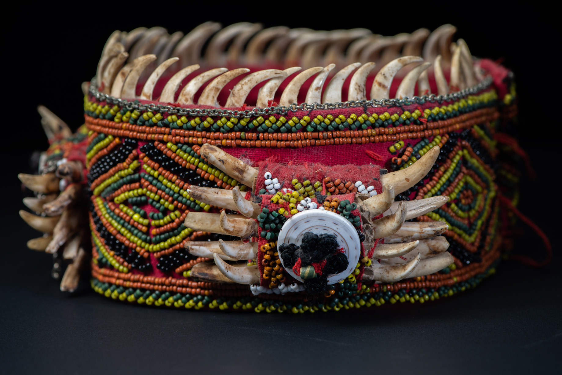這是排灣族女性在特殊場合(如婚禮和收穫祭)所佩戴的一種頭飾。其刺繡的華麗程度以及大量的野豬獠牙,顯示這頂頭飾是為村中地位崇高的貴族女性所製。
