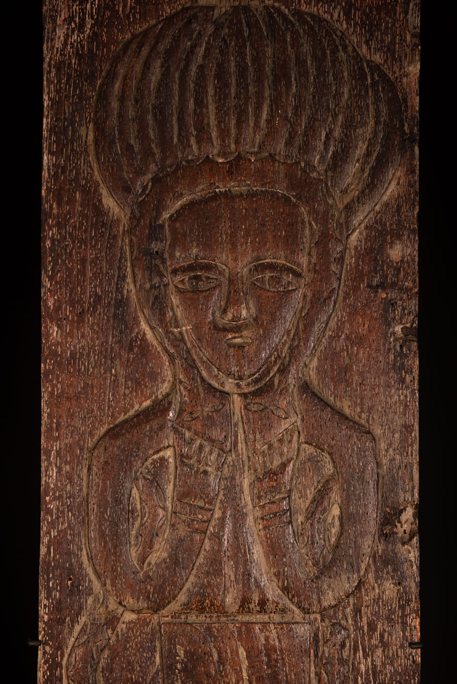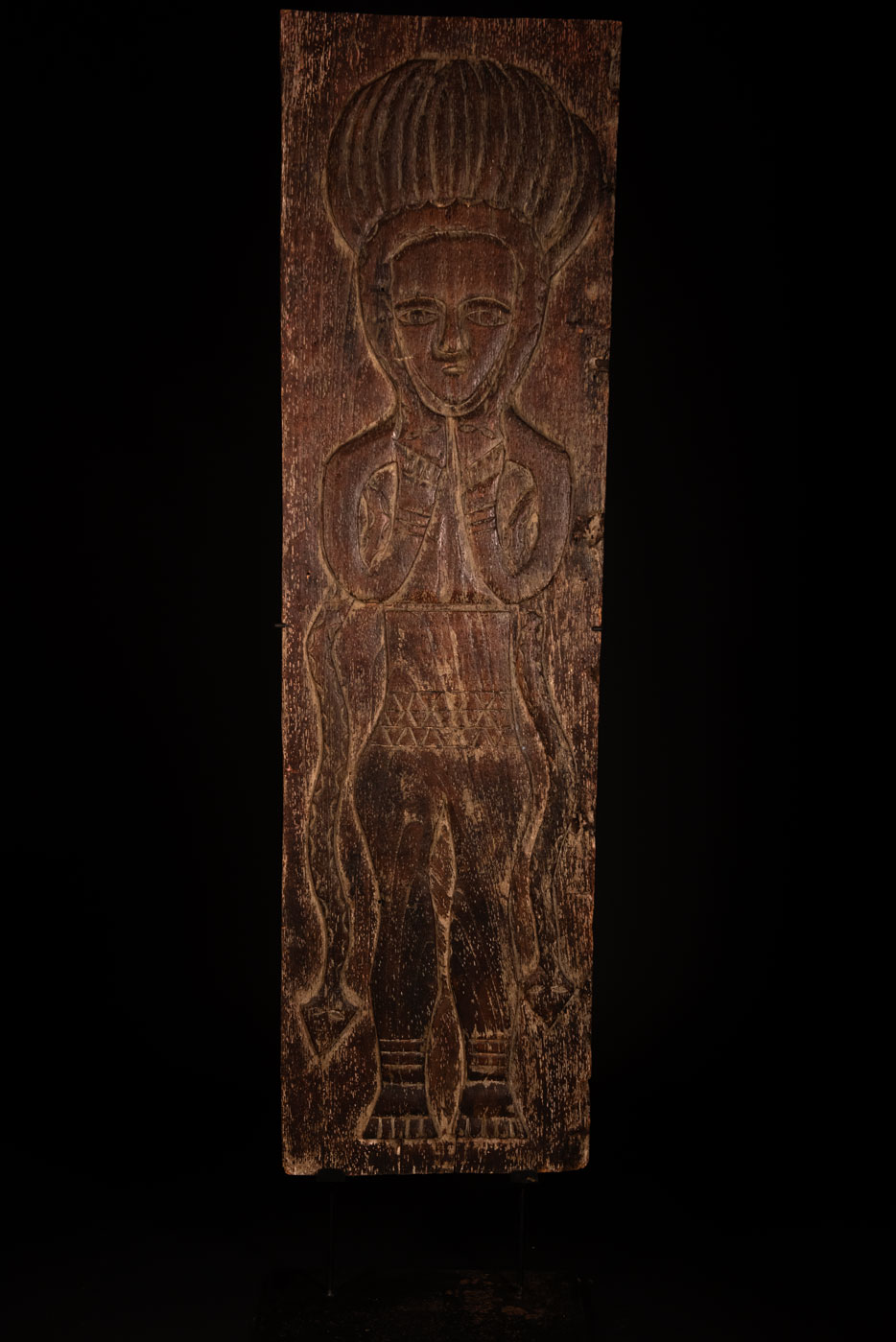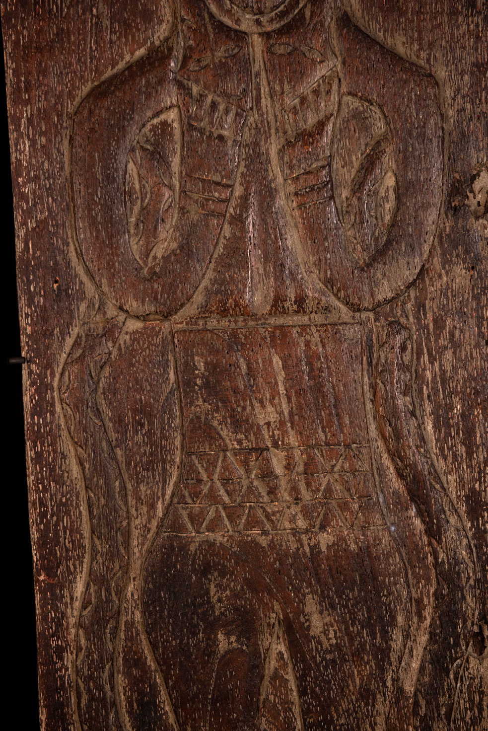 此面板以非常堅硬的木材雕刻而成,描繪了一位性別不明的貴族祖靈。雙臂交叉於胸前,雙手放在環繞臉部的蛇的兩個頭上。他頭戴飾有老鷹羽毛的帽子,象徵著戰鬥英勇與體力旺盛。另有兩條蛇纏繞其身體。