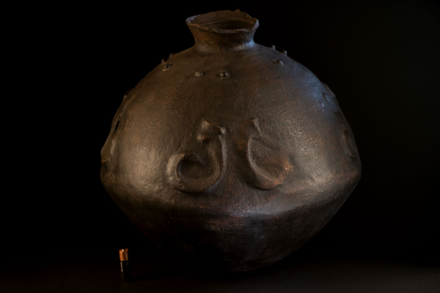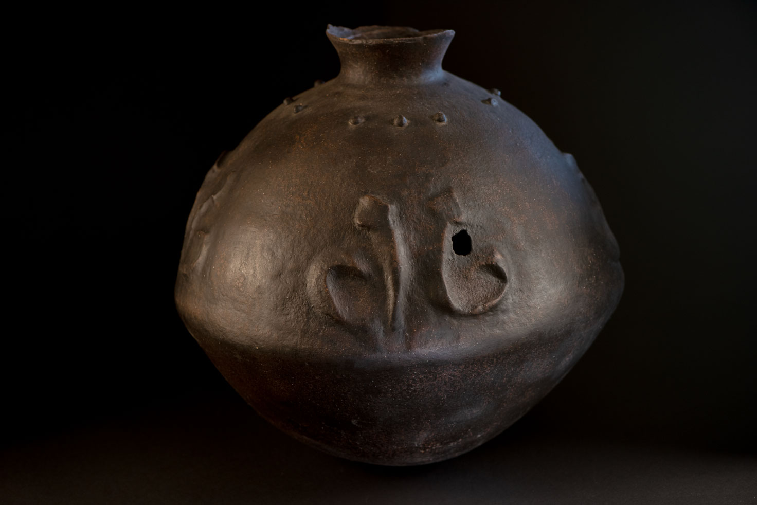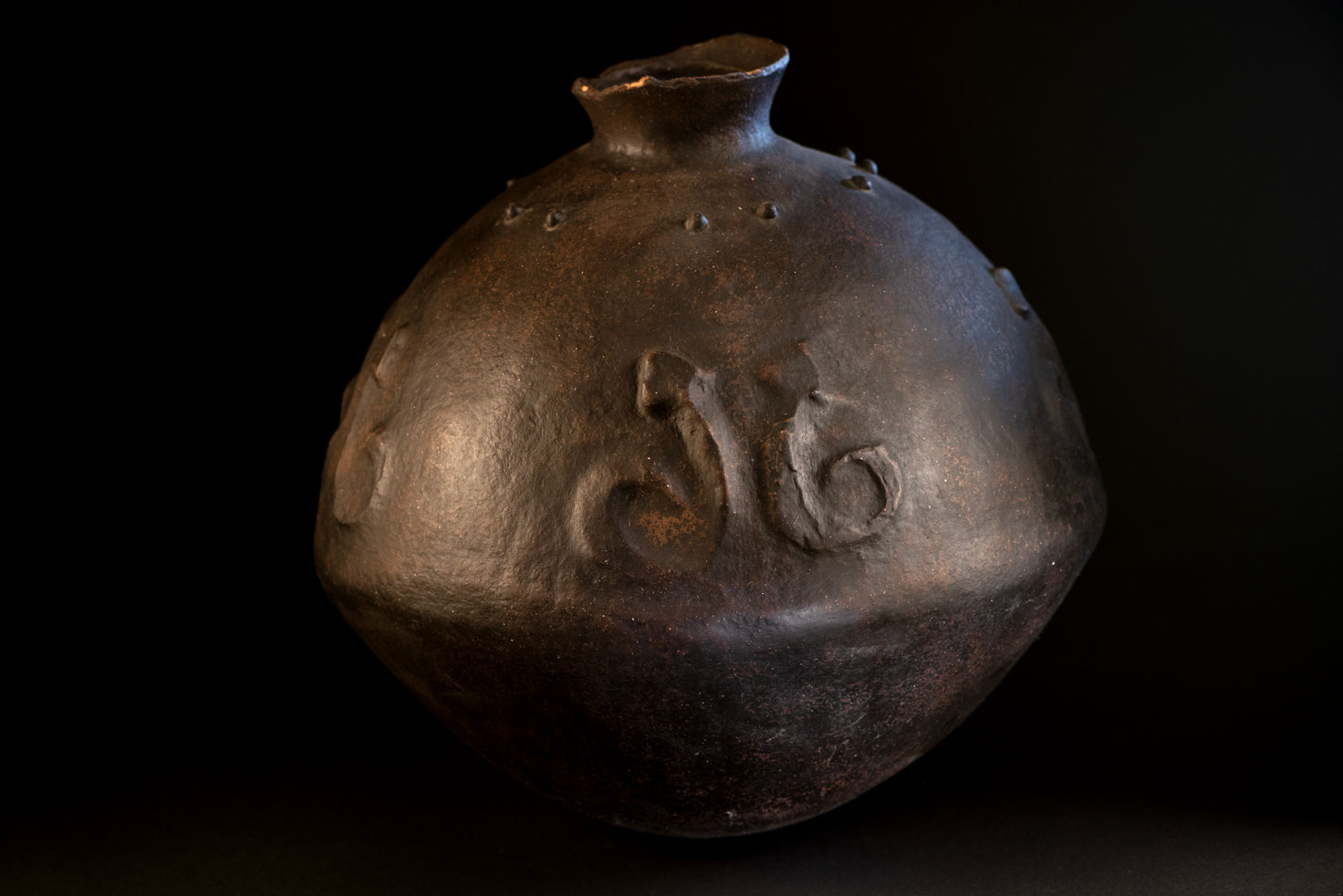 這件來自排灣族的神聖陶壺屬於雙性類型,結合了蛇紋與乳突紋裝飾。 壺口周圍缺少一些碎片。根據傳統,當兒子或女兒結婚時,父母會從壺口折下一小塊陶片。這個行為象徵對氏族關係的確認,對於女兒而言,這也是她嫁妝的一部分。