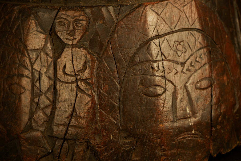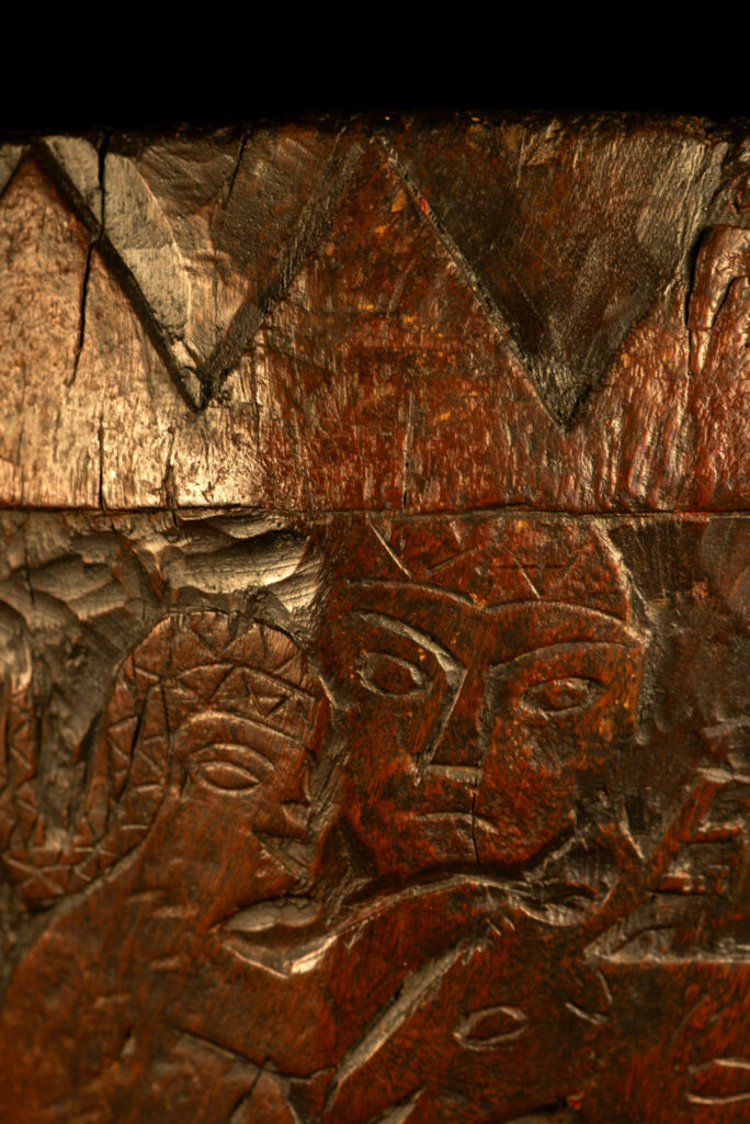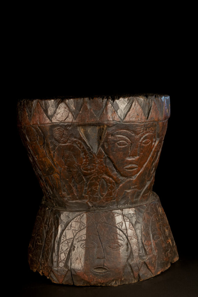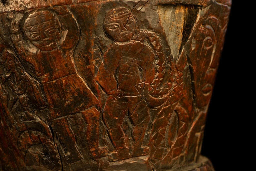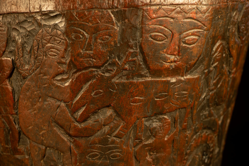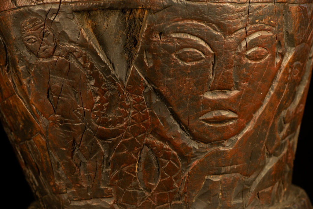 這件排灣族的大型臼雕刻有戴著蛇形頭飾的人臉與狩獵場景,表面仍可見紅色顏料的殘留痕跡。
