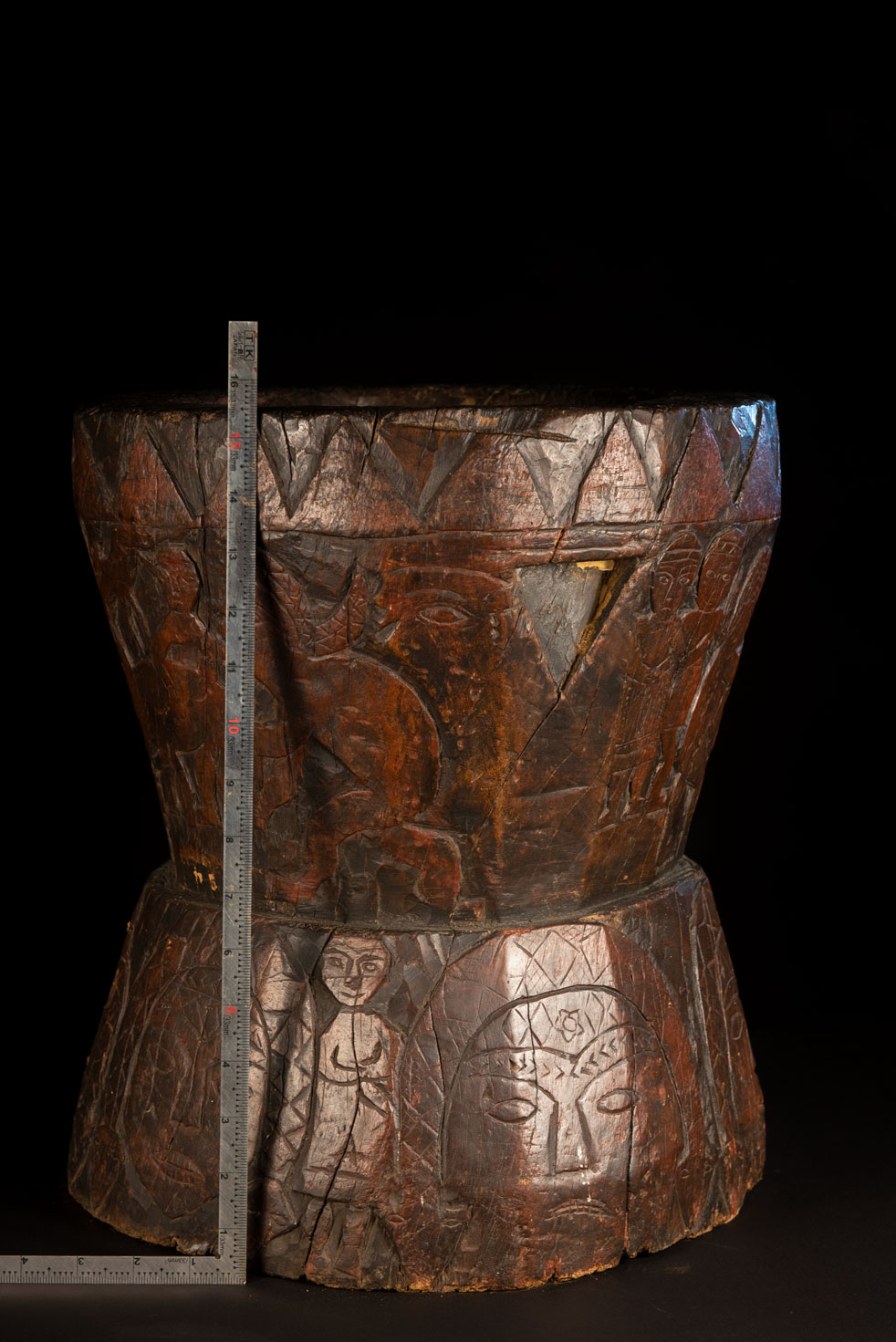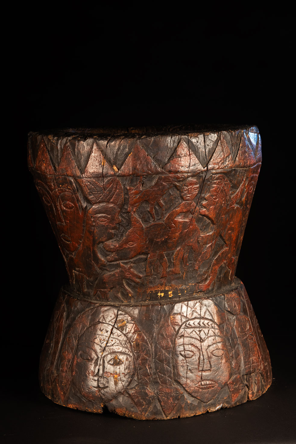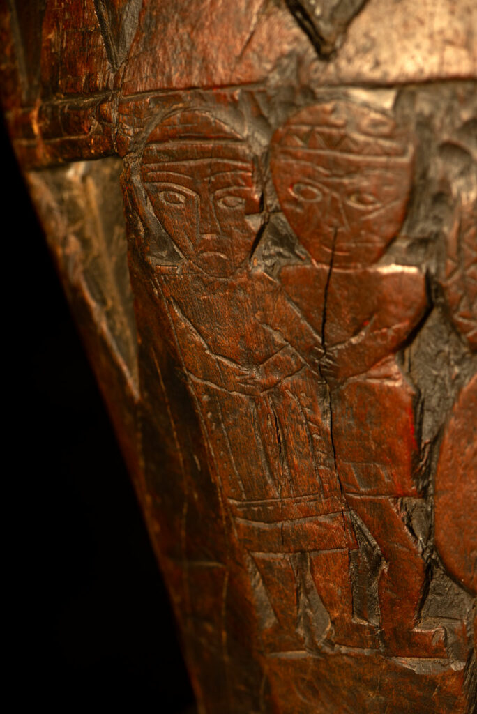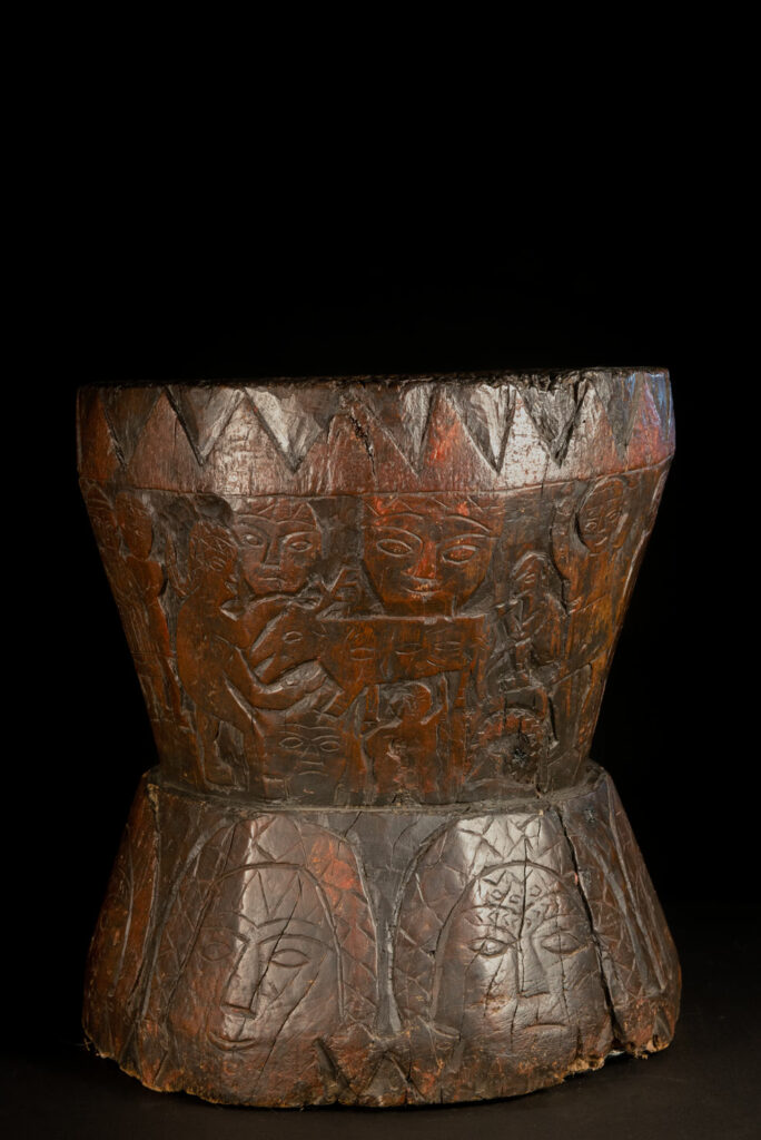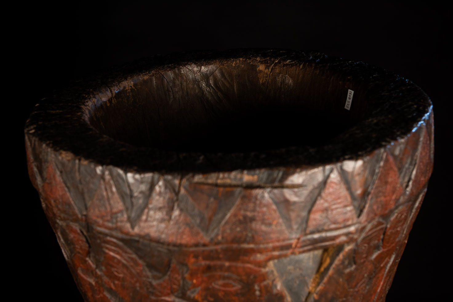 這件排灣族的大型臼雕刻有戴著蛇形頭飾的人臉與狩獵場景,表面仍可見紅色顏料的殘留痕跡。