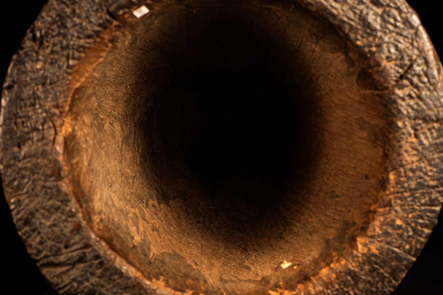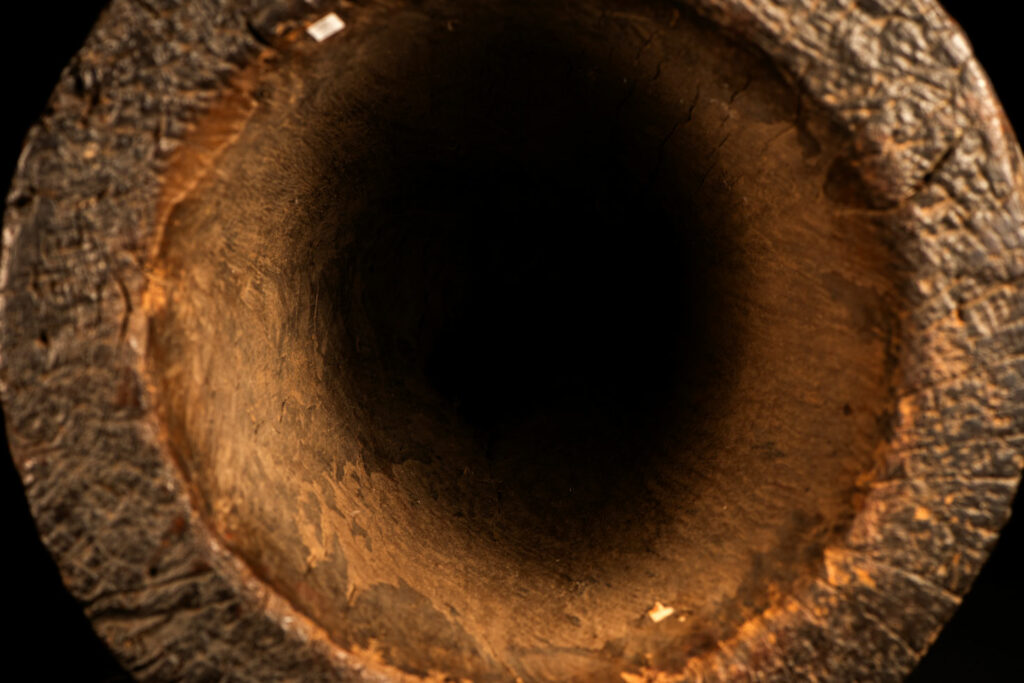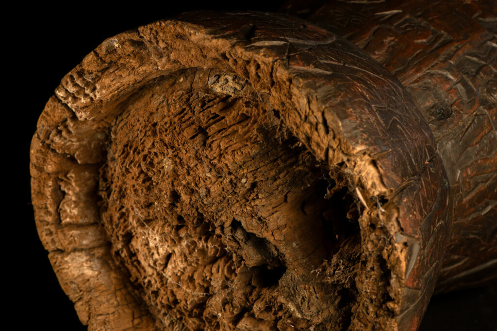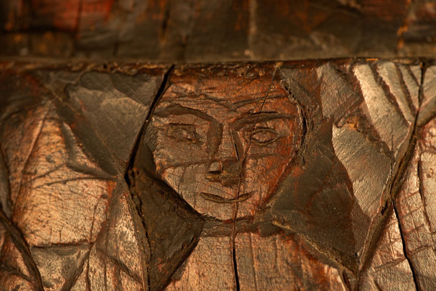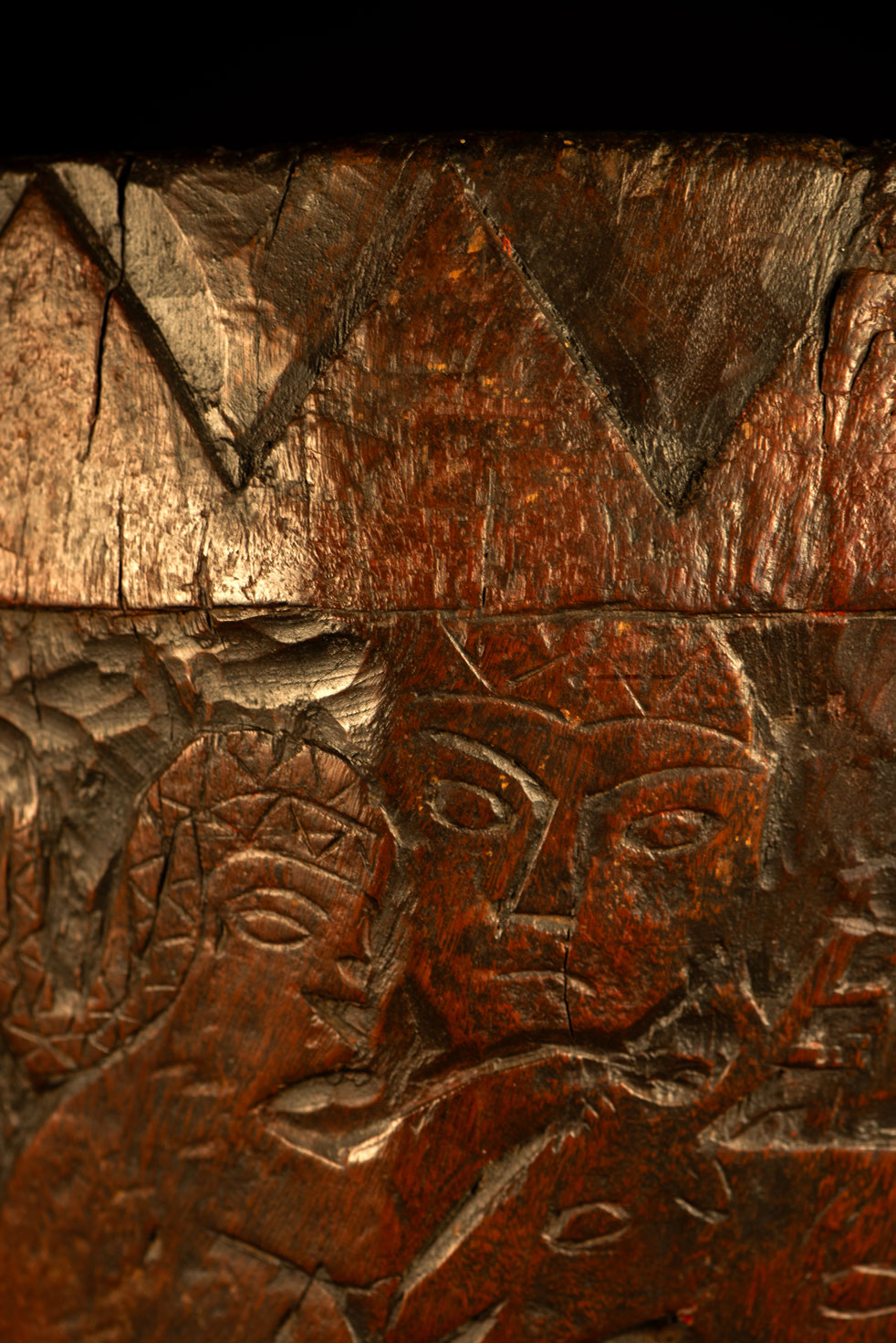 這件排灣族的大型臼雕刻有戴著蛇形頭飾的人臉與狩獵場景,表面仍可見紅色顏料的殘留痕跡。