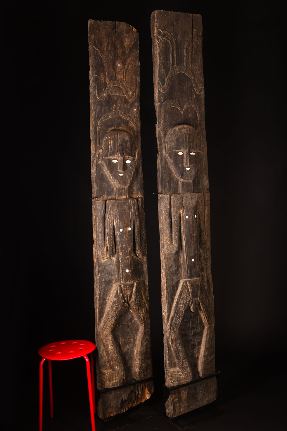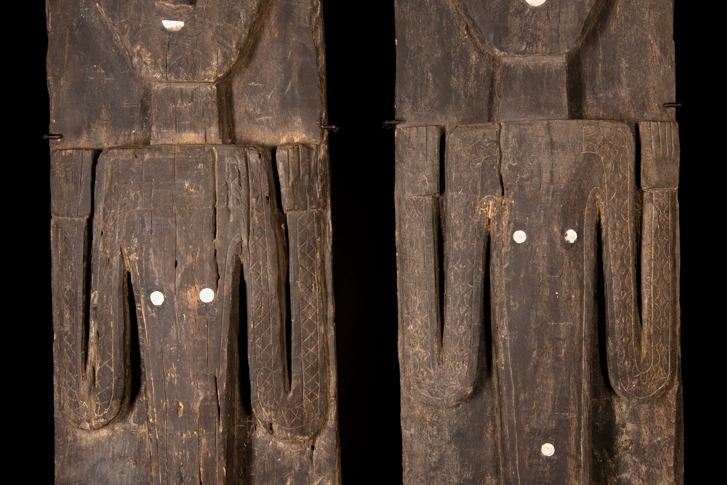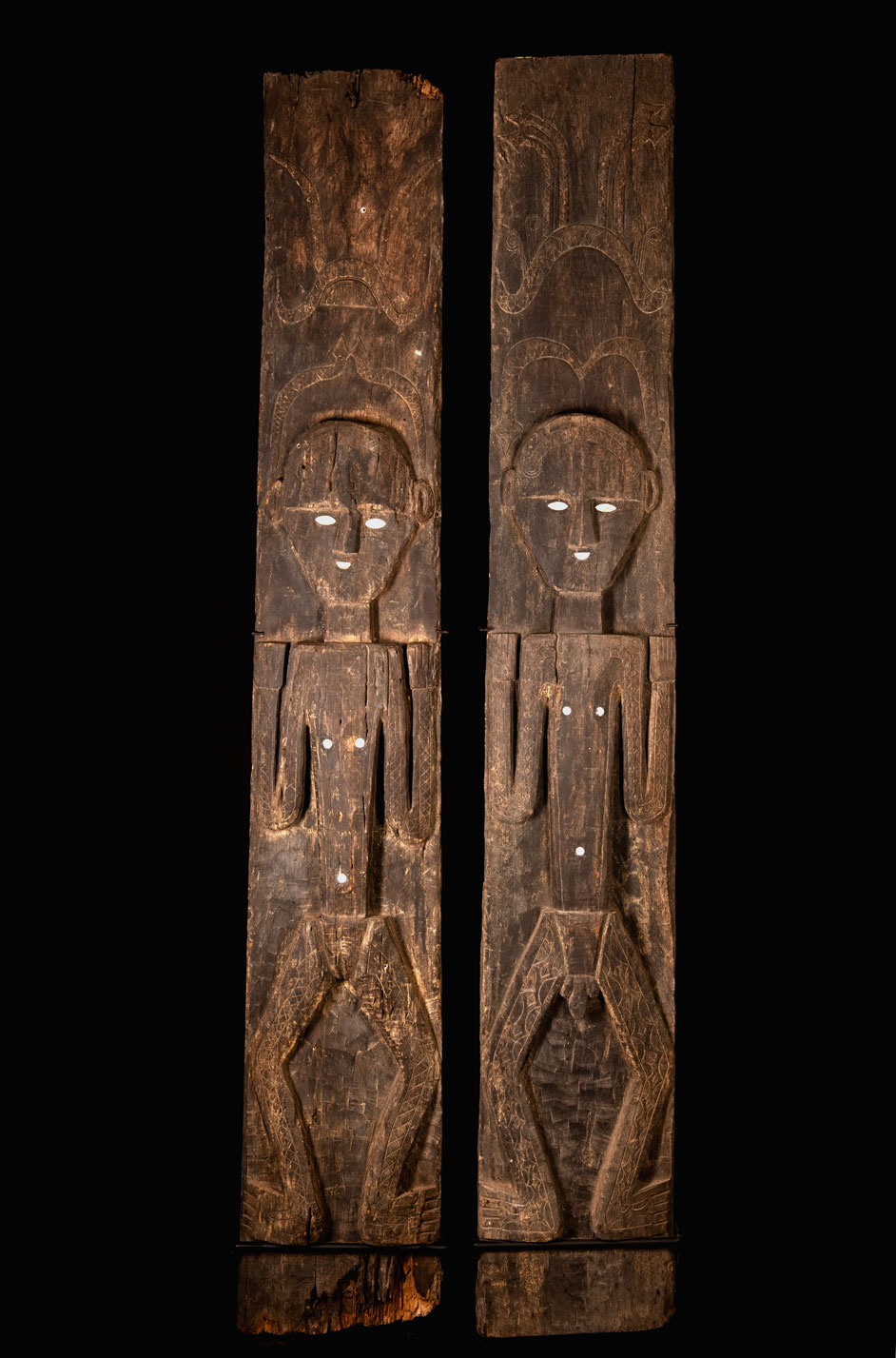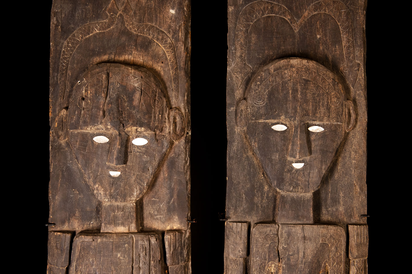 排灣族祖靈板一對,可能來自來義,雕刻有一男一女兩位人物。其眼睛、嘴巴、乳頭與肚臍鑲嵌瓷片。手臂與腿部刻有部落紋樣,象徵刺青。兩人皆戴著帽子,頭上雕刻的蛇則顯示他們是貴族的重要成員。