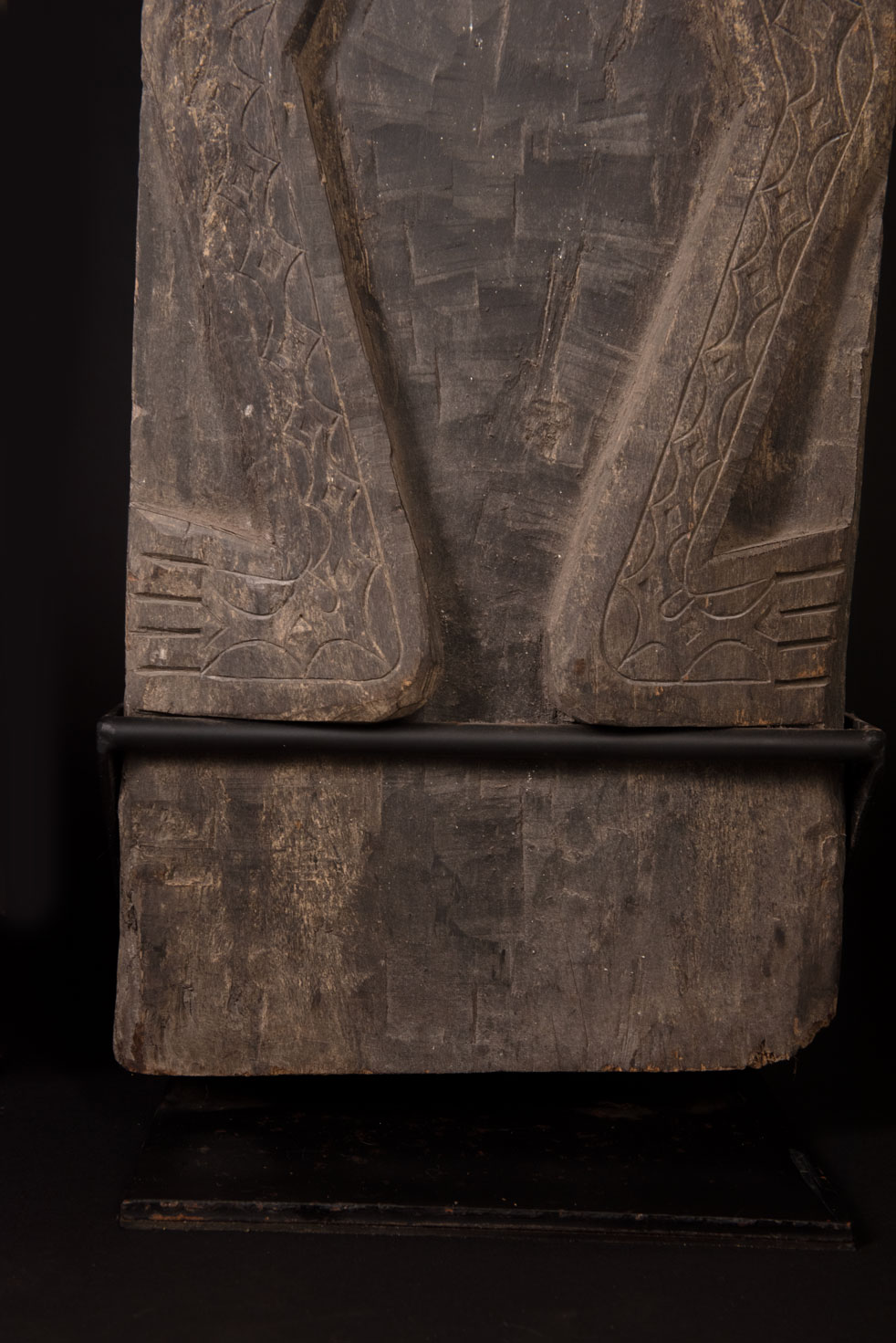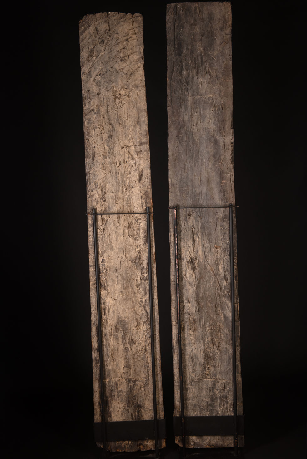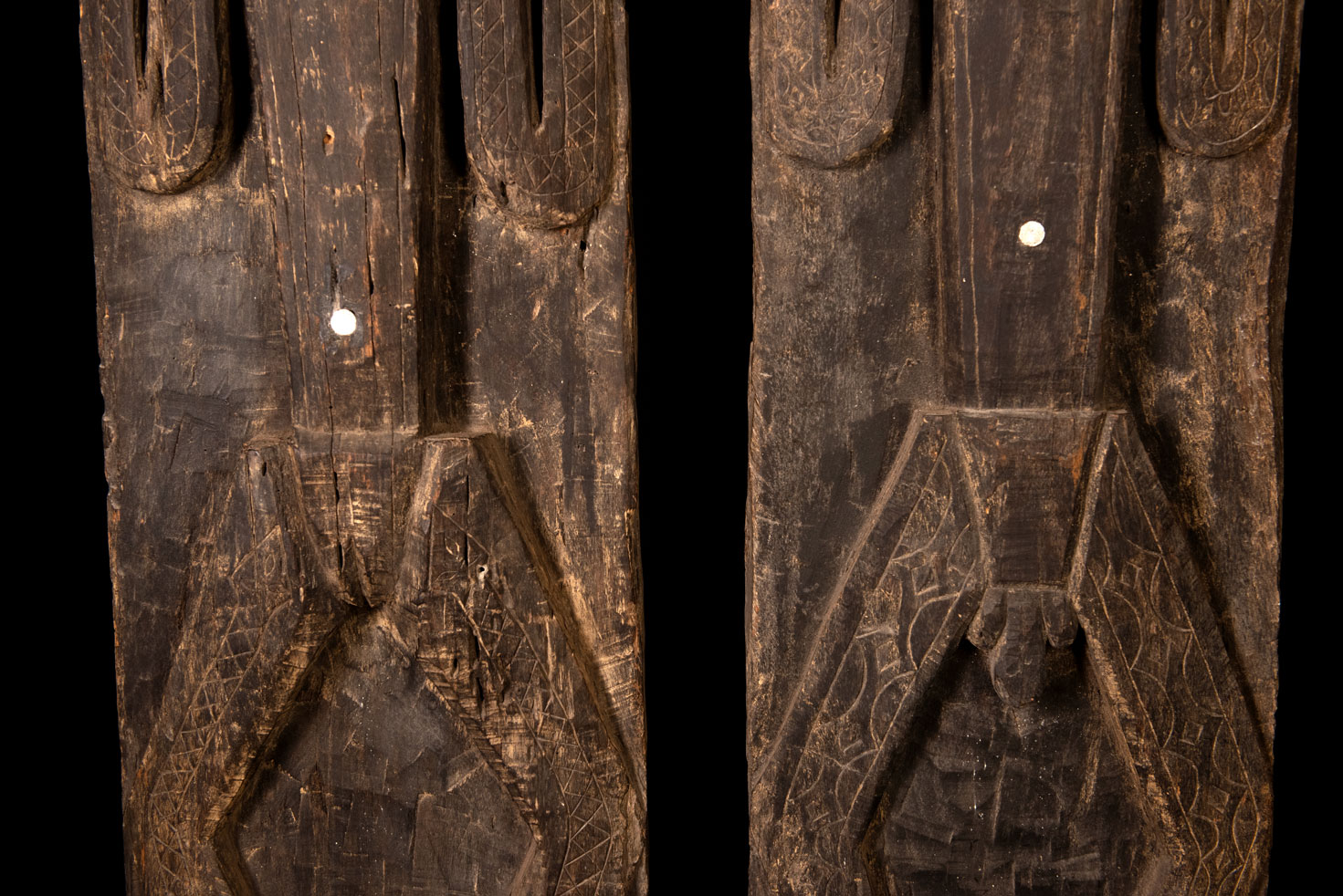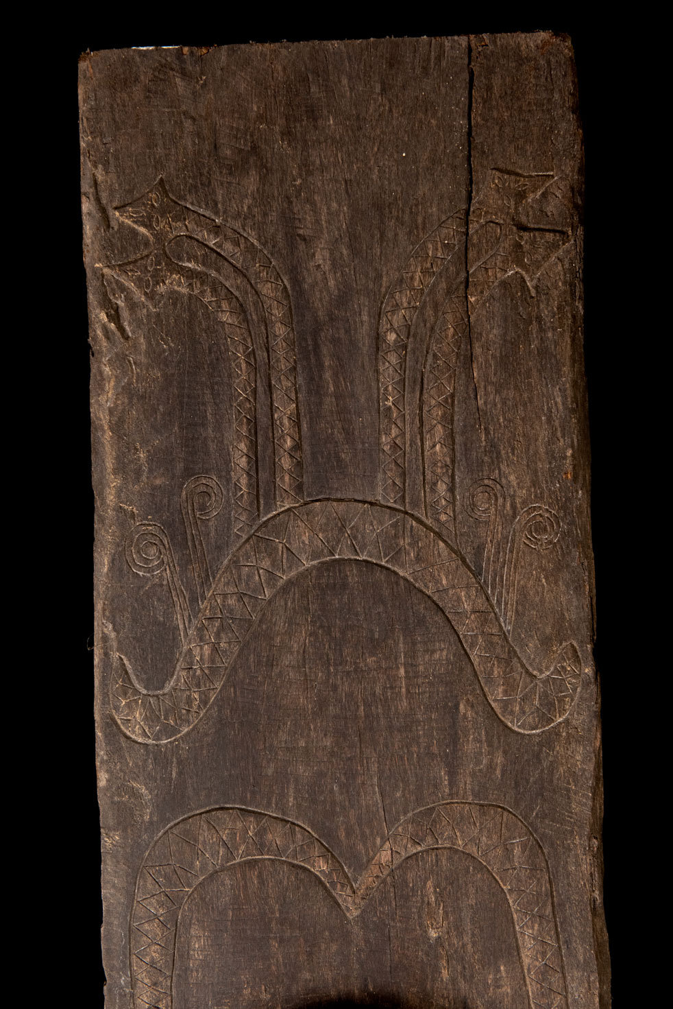 排灣族祖靈板一對,可能來自來義,雕刻有一男一女兩位人物。其眼睛、嘴巴、乳頭與肚臍鑲嵌瓷片。手臂與腿部刻有部落紋樣,象徵刺青。兩人皆戴著帽子,頭上雕刻的蛇則顯示他們是貴族的重要成員。