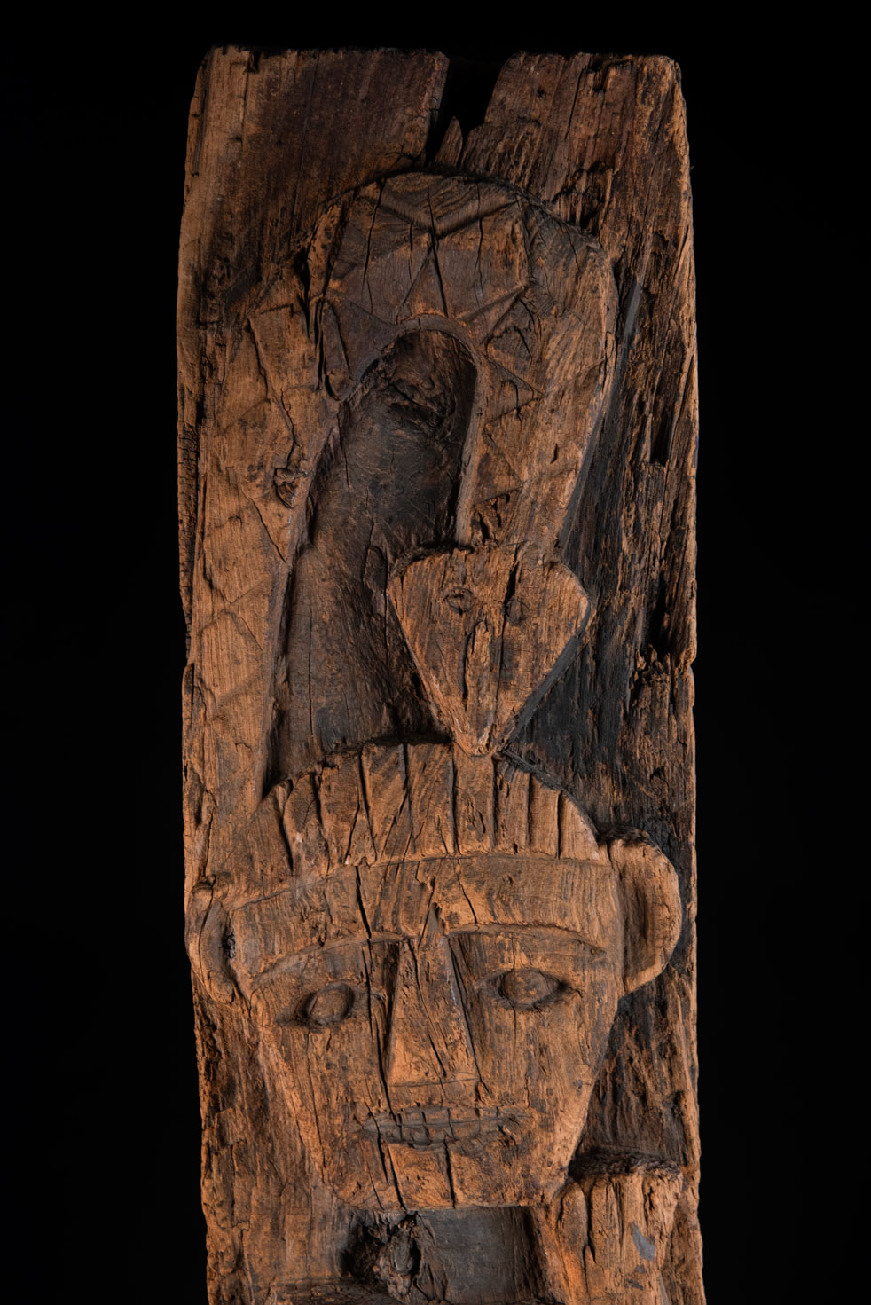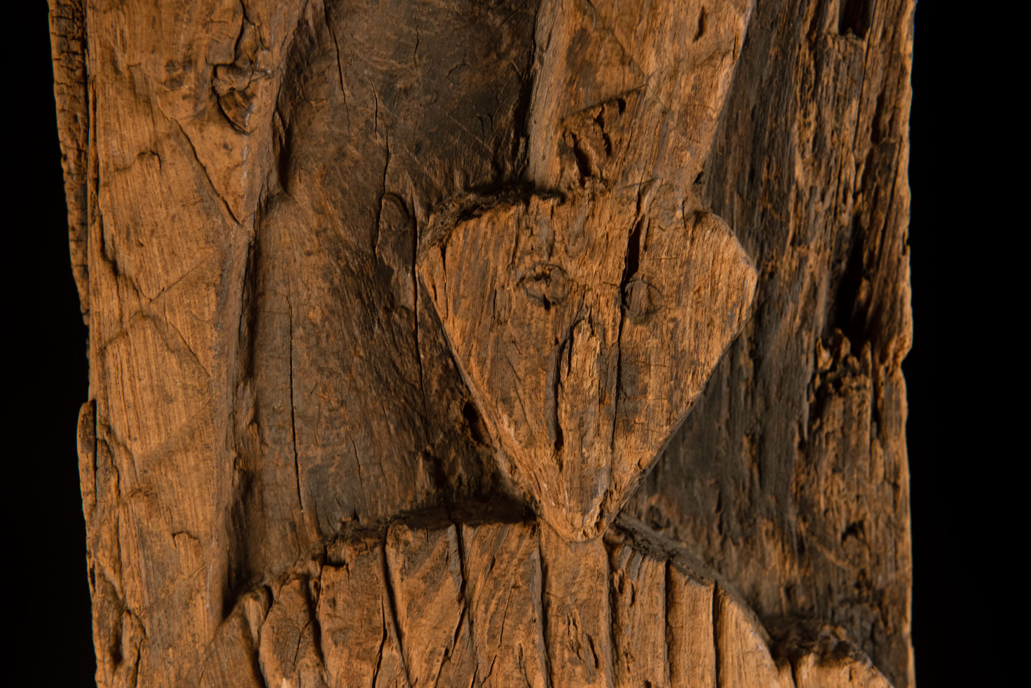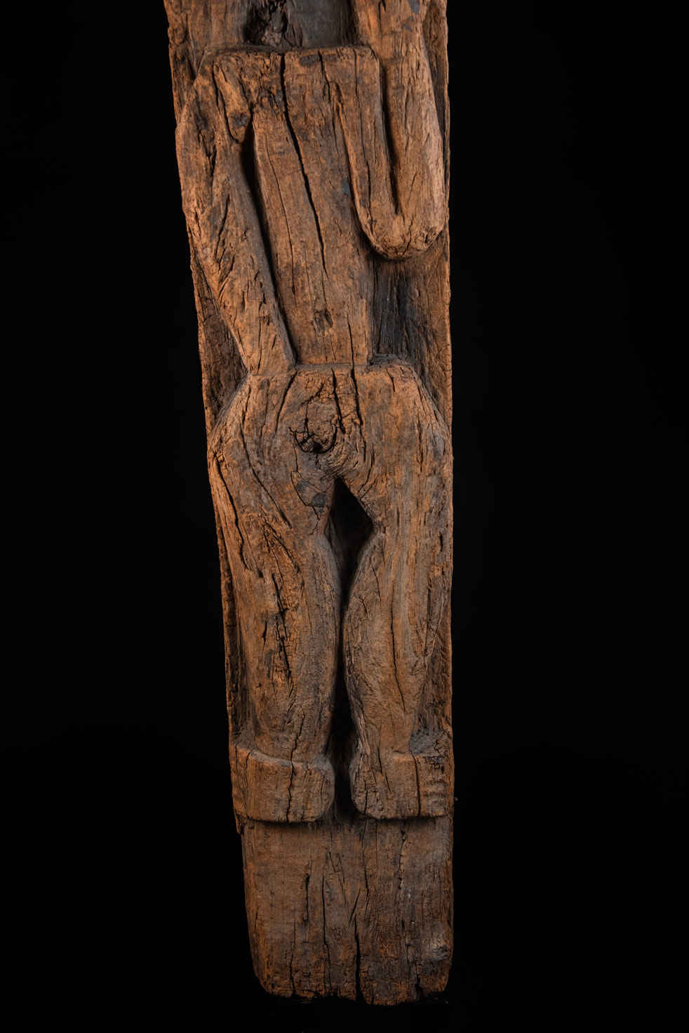 儘管這件作品雕刻的是一位祖靈,其尺寸——高120公分、寬19公分、厚9公分——加上其木材的密度與重量,顯示它很可能曾被用作房屋正面橫樑的外部支柱之一,位於門口一側,很可能是右側,這從神聖蛇紋的形狀可以推測出來。我們可以想像,門的左側則是一根雕刻女性祖靈的相似支柱。