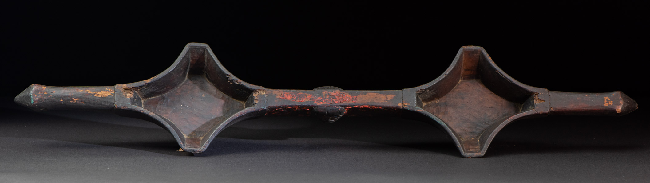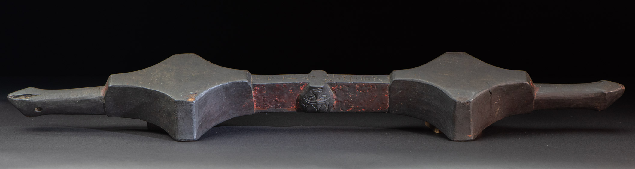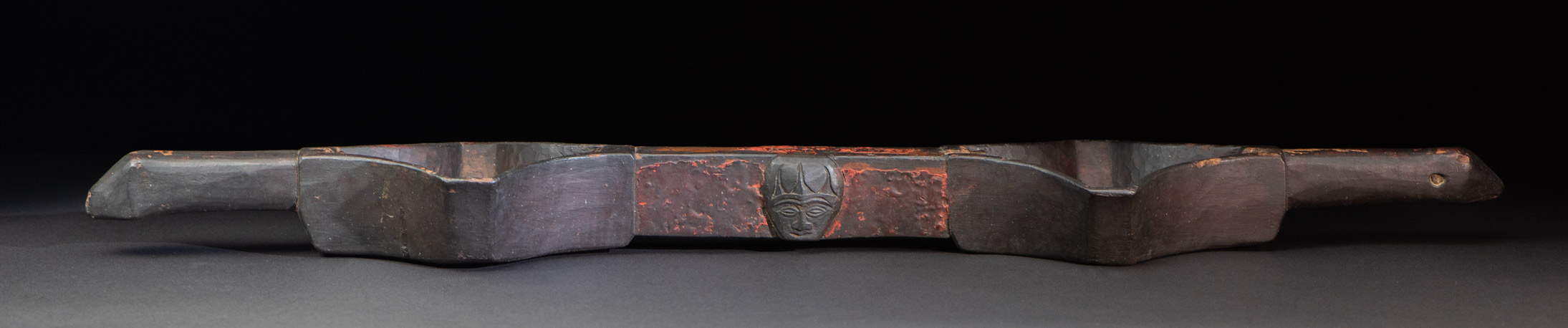 排灣族的連杯文化 連杯在排灣語中稱為 ragal,是排灣族傳統的飲酒器具。其形式多樣,包括單杯、雙杯與三杯相連的樣式。雙連杯和三連杯是由單連杯演變而來,其中雙連杯最為常見與廣泛使用。 這種特殊的器具由兩個方形杯子透過中間把手連接,兩端還有手柄,可供兩人同時飲用,一人用右手,另一人用左手。此設計既實用又富趣味性,常用於婚宴與祭儀場合中。 連杯的雕刻工藝亦極為精美。把手與連接處常雕有人頭、人物、盤蛇、蛇頭、鹿頭、豬頭、蛇形、蛙形蚊子、獵槍等圖案,展現出排灣族深厚的精神與文化內涵。 台灣其他原住民族,如泰雅族、賽夏族與鄒族,也有共飲的習俗,但他們並不使用連杯,而是共用一個杯子,以表達主人對賓客的最高敬意。 此件作品杯口呈菱形,中間的把手上雕有一個人頭圖案,並以紅黑顏料塗繪,更顯文化與視覺之美。