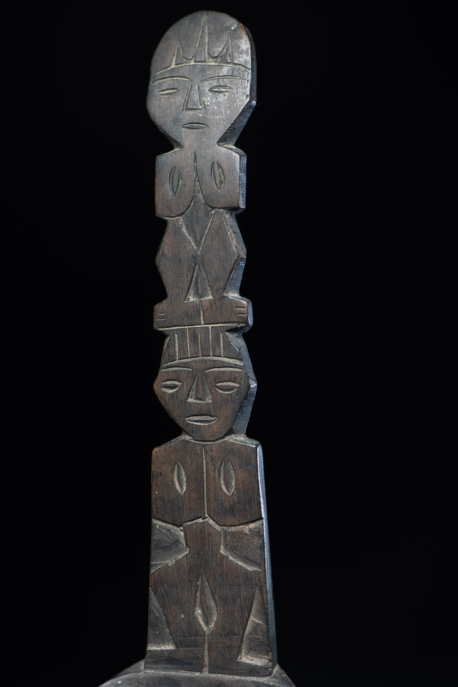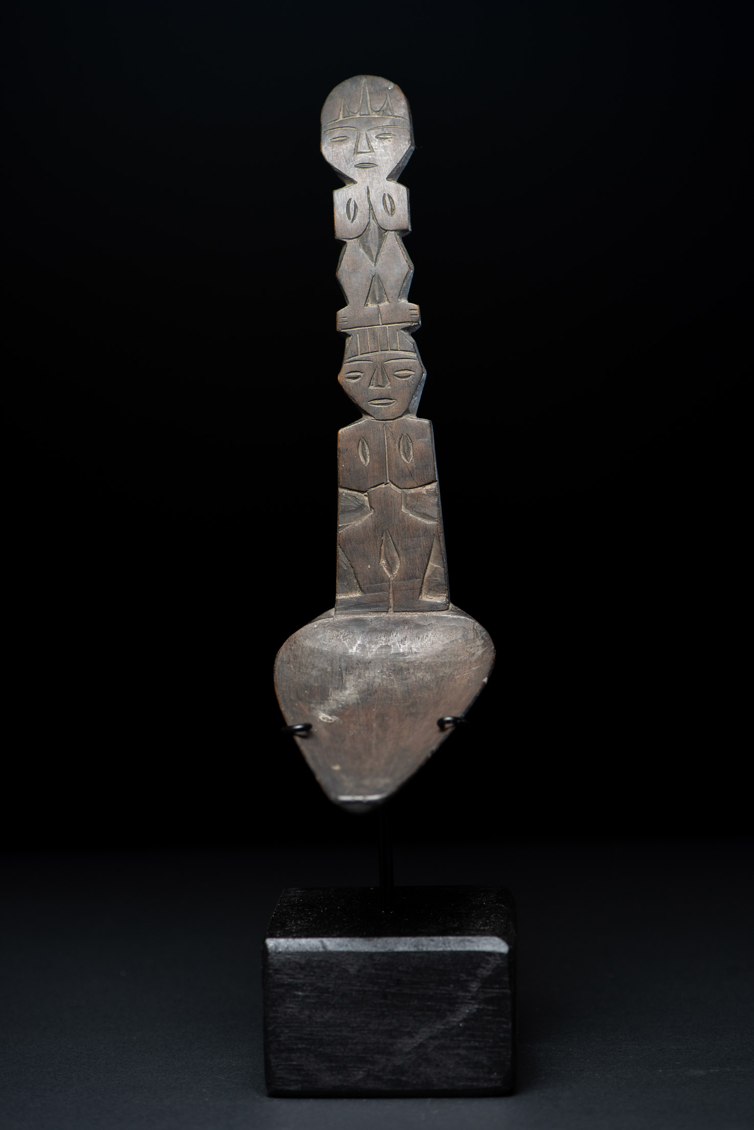 排湾族一对木勺,雕刻着男性与女性人物,可能象征一对夫妻。有时这类勺子是孩子送给父母的礼物,表达敬意和爱意。可能由孩子亲手雕刻,也可能委托村里的雕刻师制作。