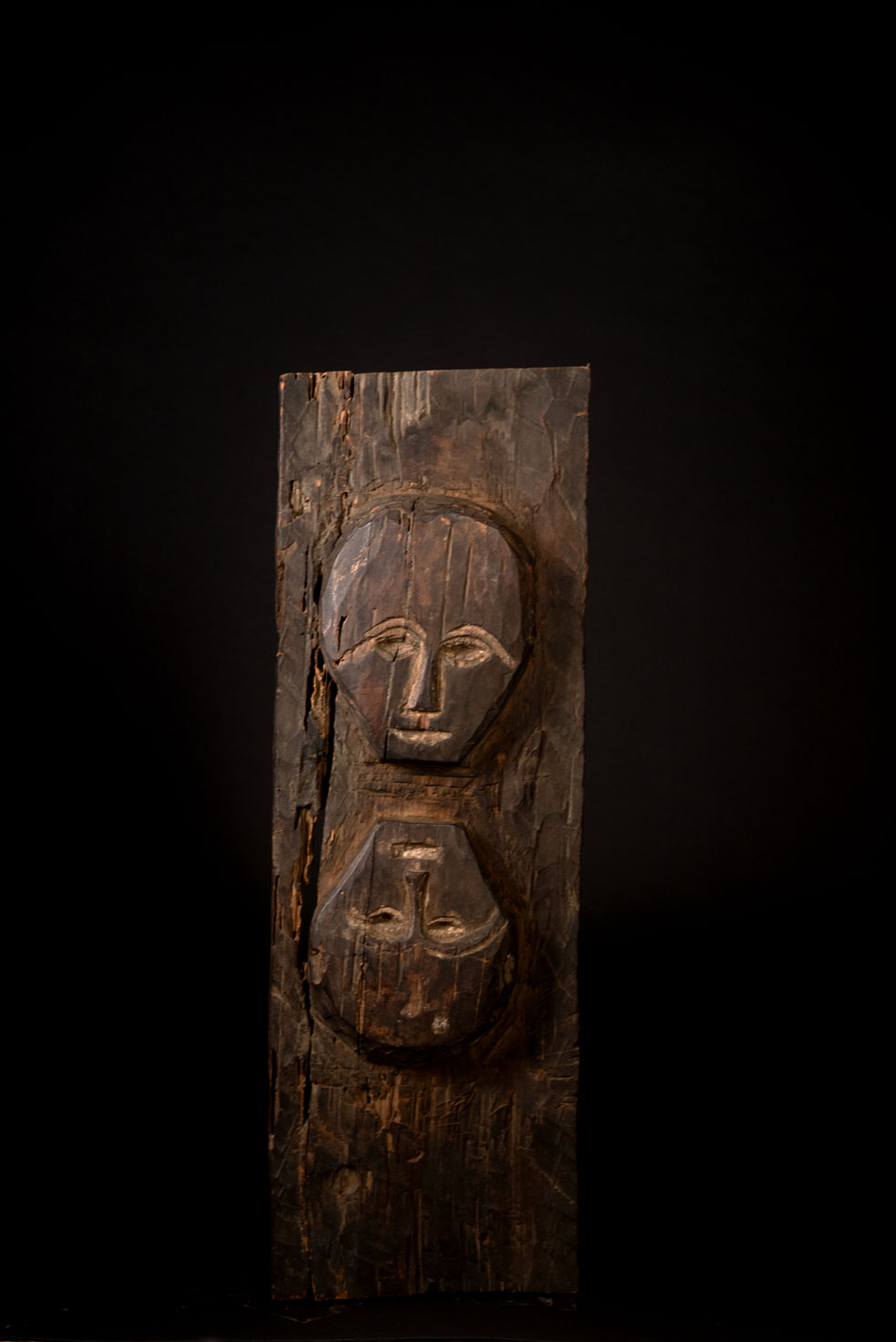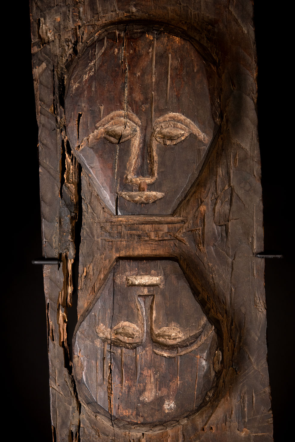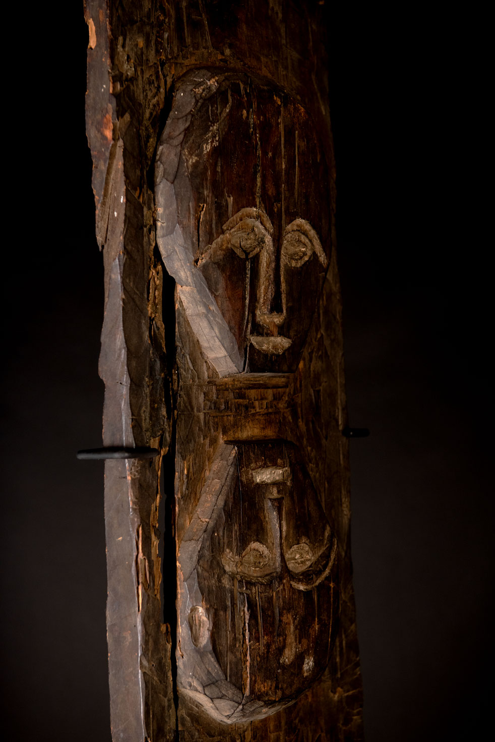 這根來自魯凱族的柱子,可能採集自多納村,原本長度為180公分。它是用來支撐屋頂橫梁的外柱之一。目前僅保存了82公分,其餘部分可能因損壞嚴重而未能保留。兩個雕刻的頭部是這根柱子上唯一有裝飾的部分。