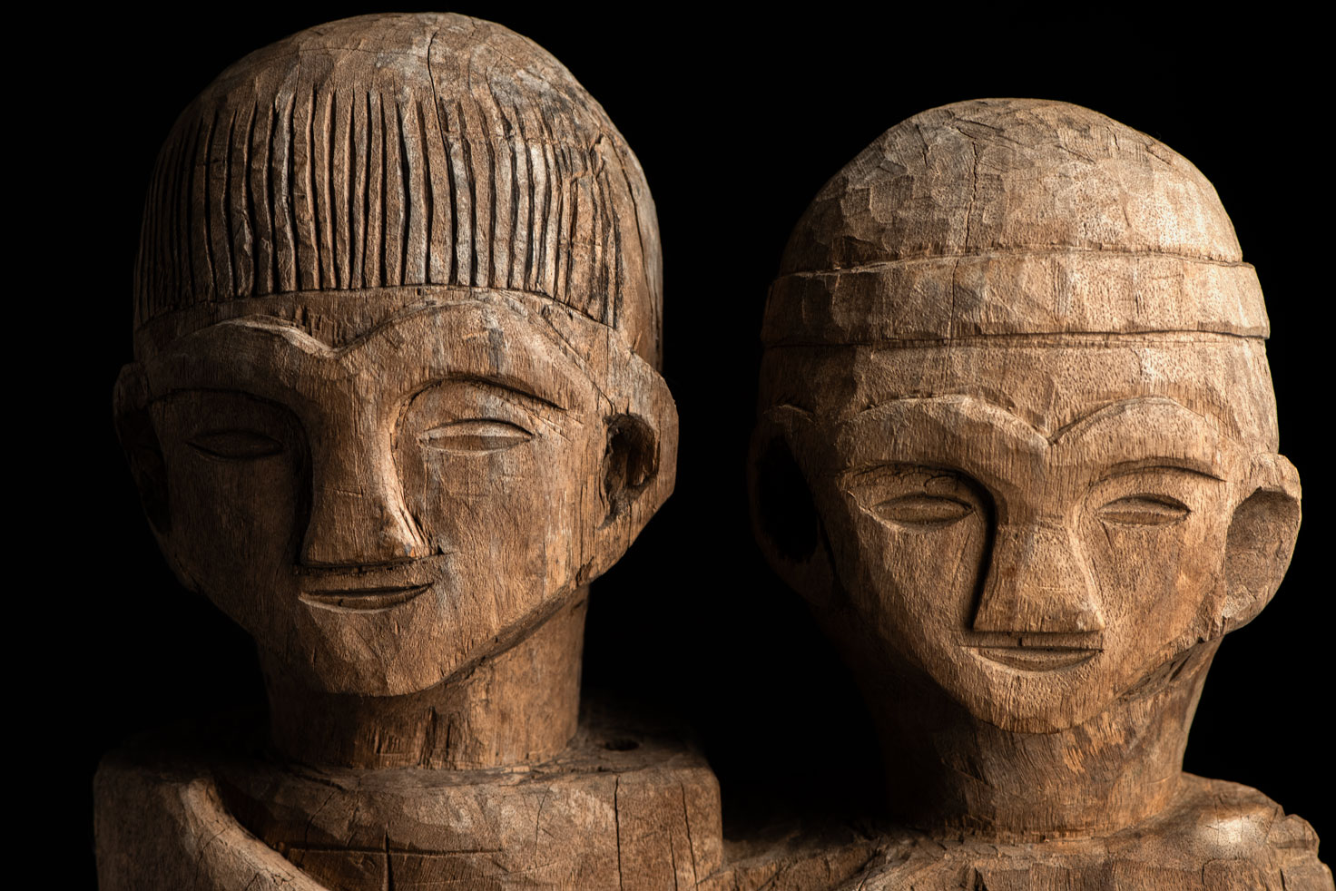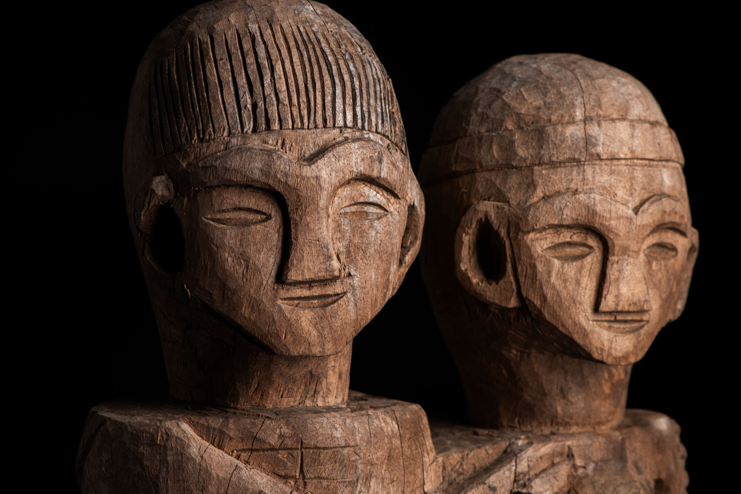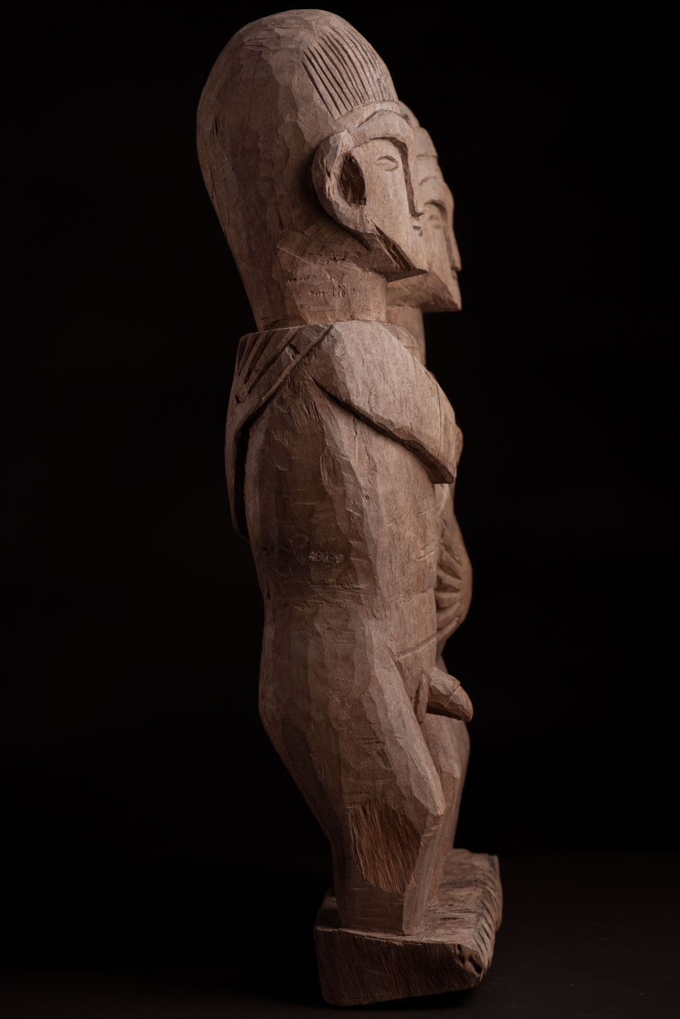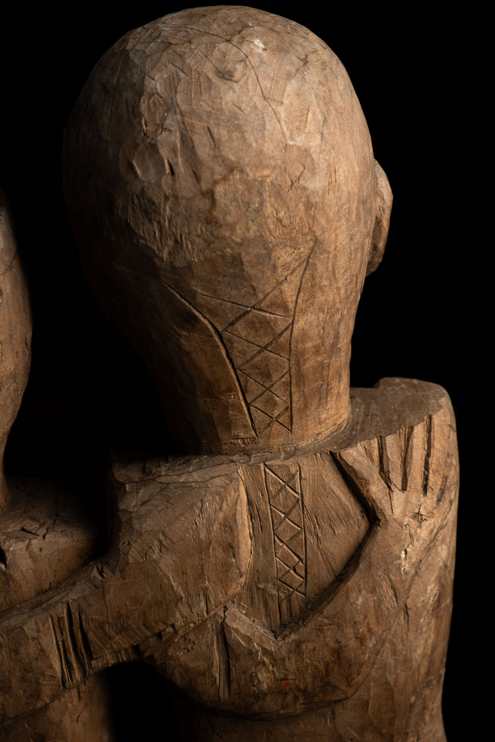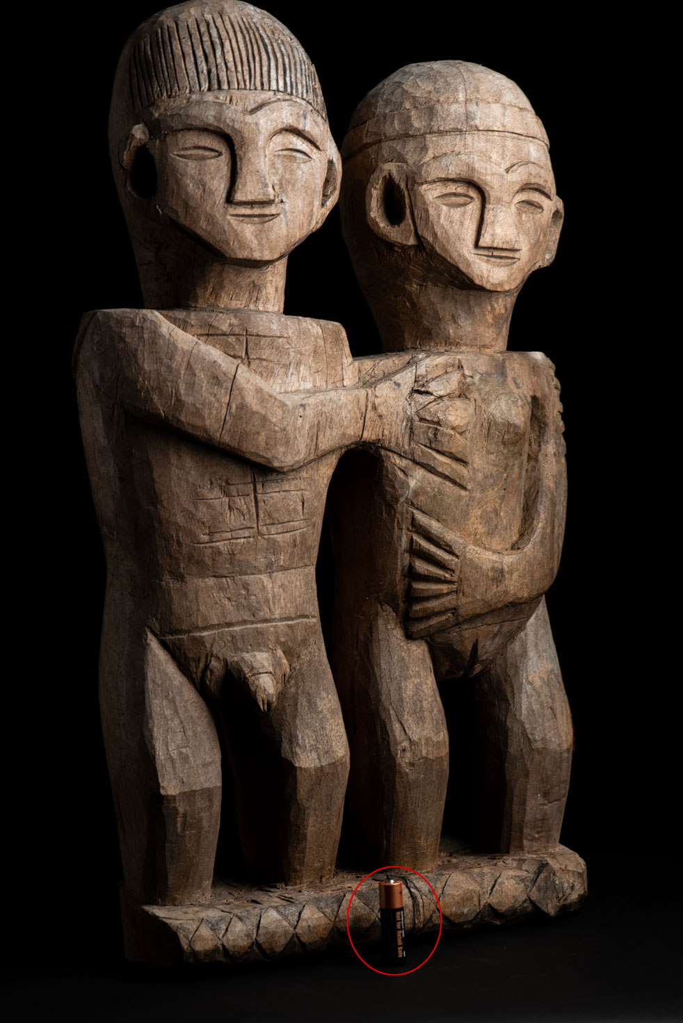 這尊祖靈雕像描繪一對夫妻。男子略高於妻子,右手放在她的胸前,左手則輕搭在她的肩上。女子一手放在腹部,象徵生育,另一手則搭在丈夫的肩膀上。兩人皆為裸體呈現。雙手的姿勢充滿象徵意涵,令人讚嘆。 夫妻腳下刻有神聖百步蛇的圖騰紋飾,象徵他們的貴族身分。雕像底部可見黑色顏料的殘留痕跡。 雕刻工藝精湛,象徵細膩,顯示此作品出自一位技藝高超的雕刻師之手。