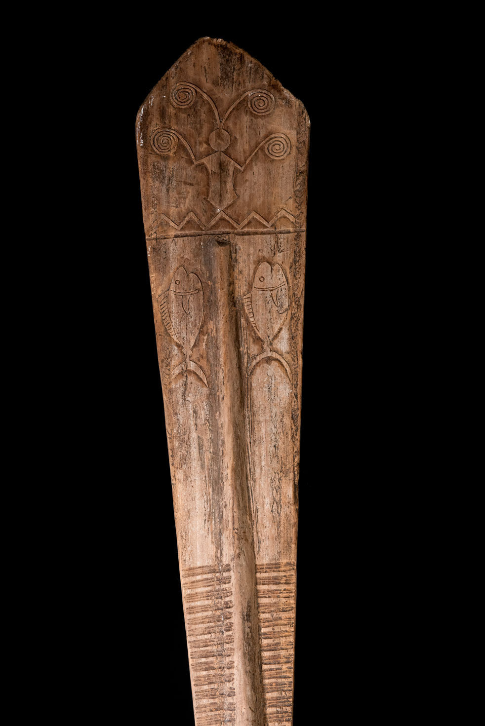 Carved paddle from The Yami tribe located on Orchid island, Taiwan, used exclusively during religious or festive ceremonies. This paddle is carved on one side with Magamaog, the Yami most important deities and 2 fishes . This paddle was probably paint in red, white and black in the past.