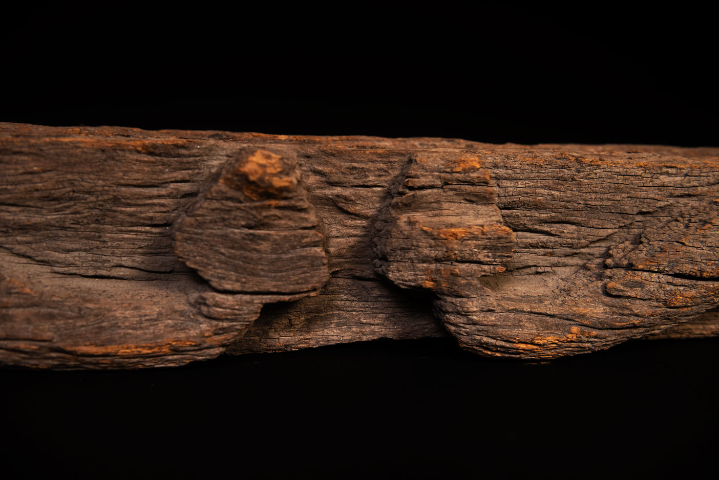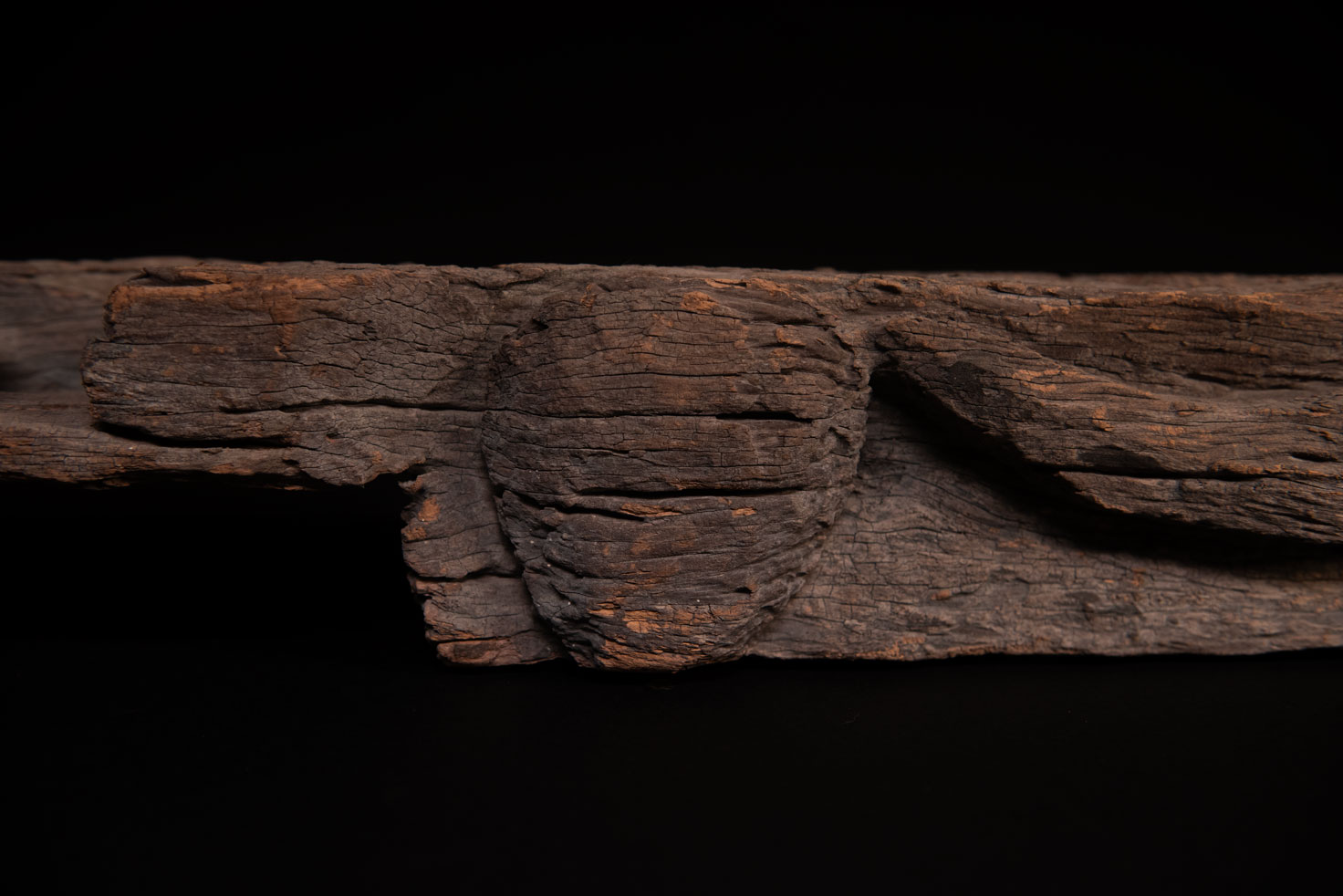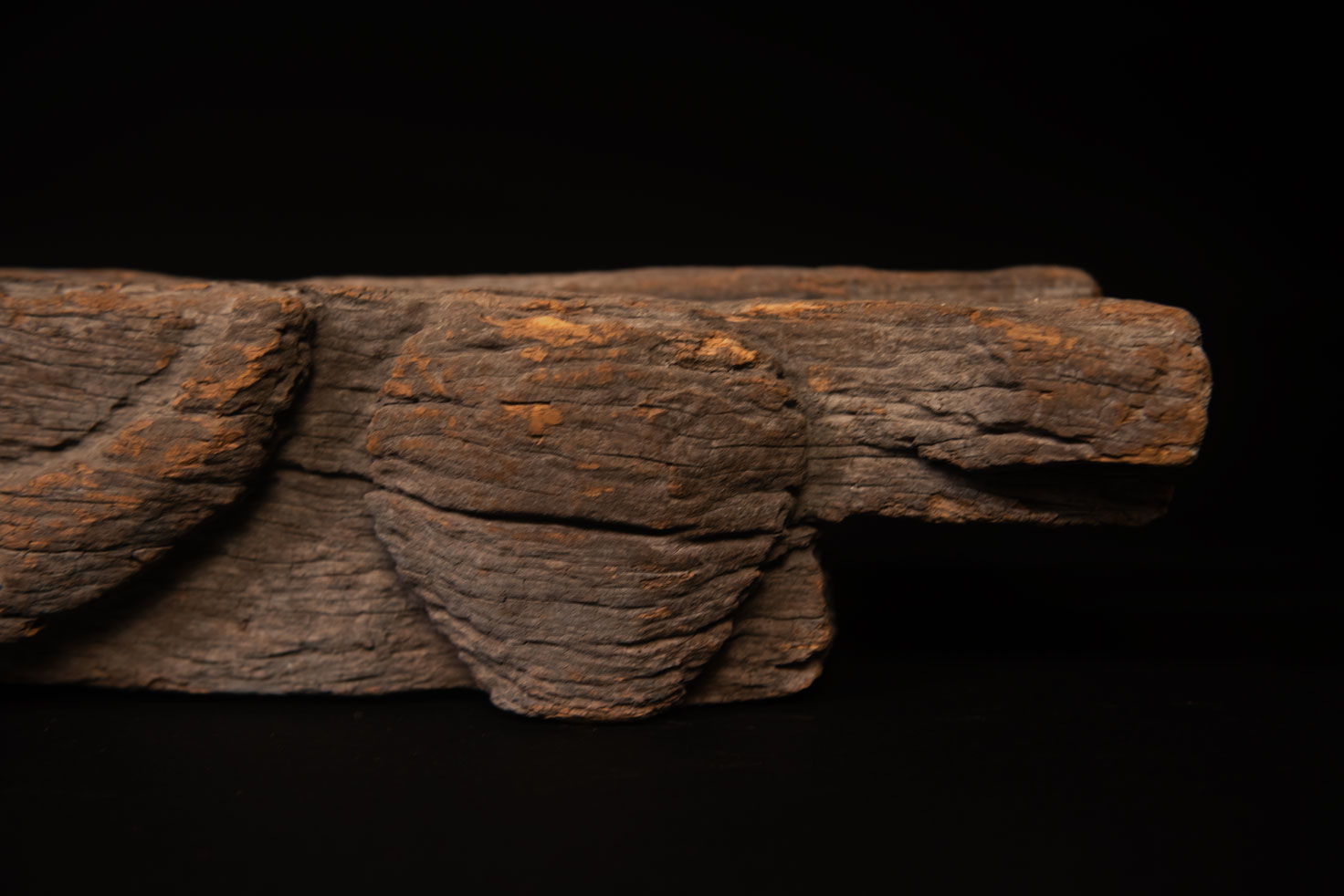 This piece, likely positioned above the entrance door and exposed to the elements—as suggested by its degree of erosion—is carved with two snakes and two heads.