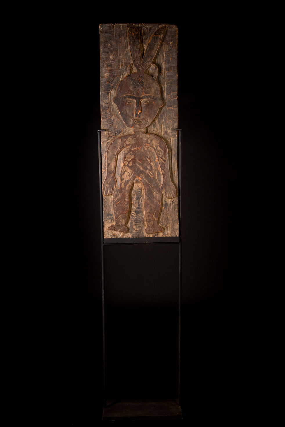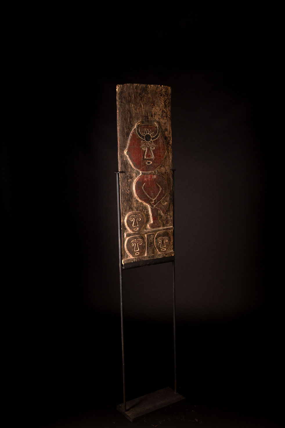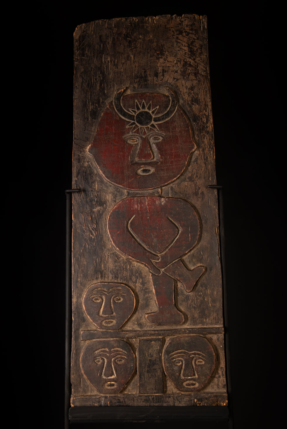 This double-sided carved panel from the Paiwan tribe was part of a partition separating the bedroom from the living area. It was exhibited from December 2007 to September 2008 at the Shisanhang Museum of Prehistory in Taipei County, during a special exhibition dedicated to Paiwan culture. It is listed in the exhibition catalogue.
