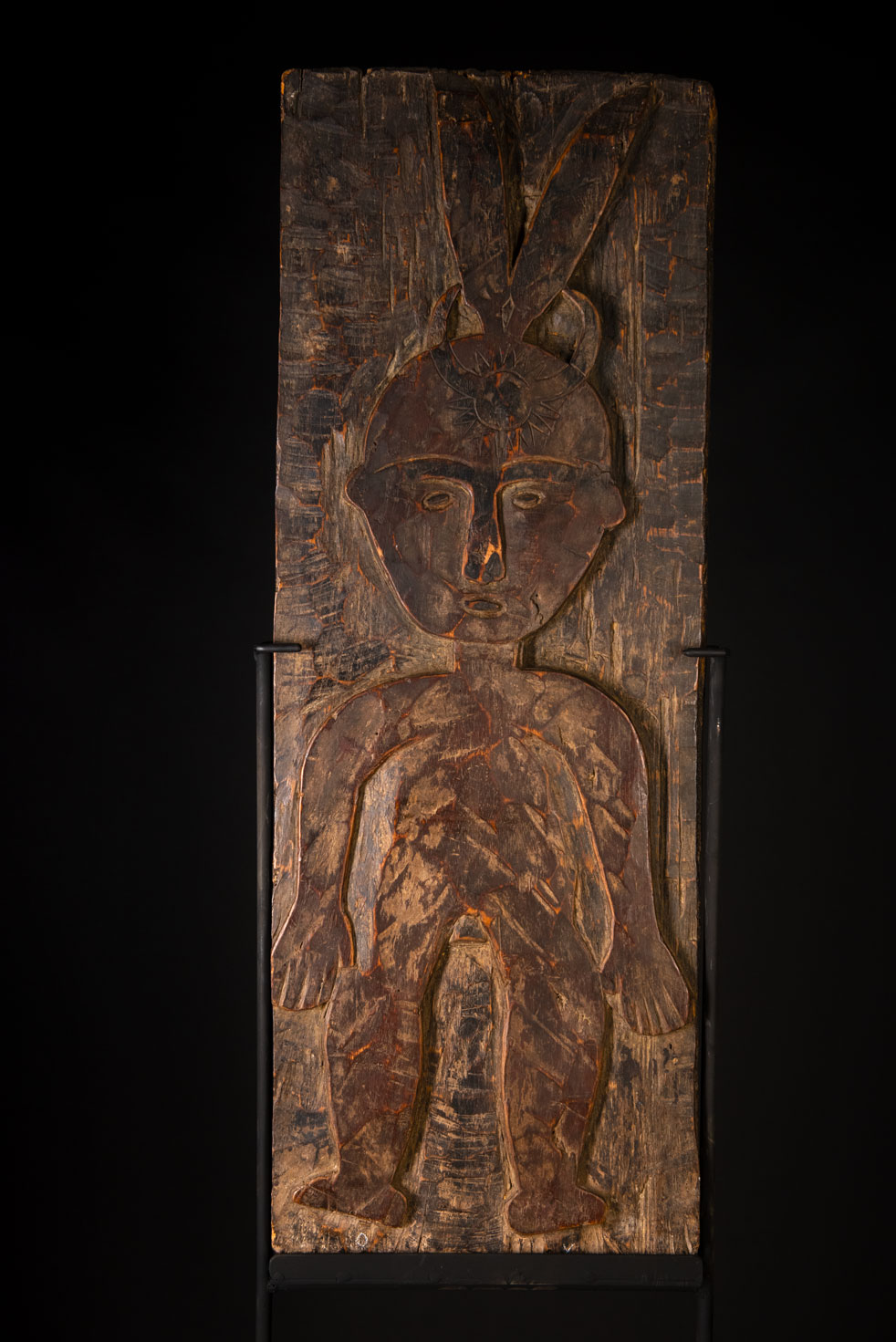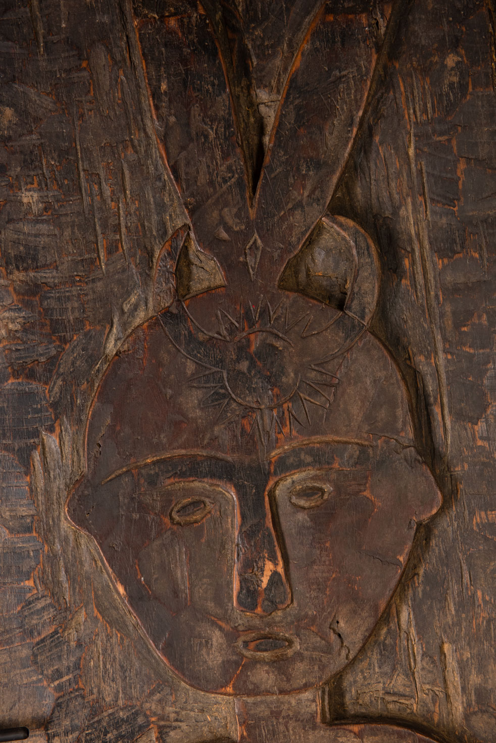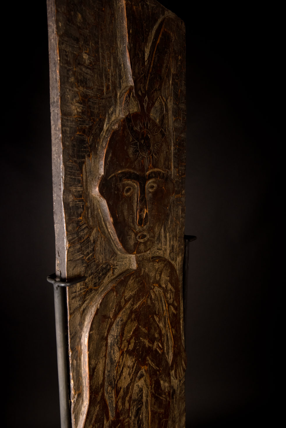This double-sided carved panel from the Paiwan tribe was part of a partition separating the bedroom from the living area. It was exhibited from December 2007 to September 2008 at the Shisanhang Museum of Prehistory in Taipei County, during a special exhibition dedicated to Paiwan culture. It is listed in the exhibition catalogue.