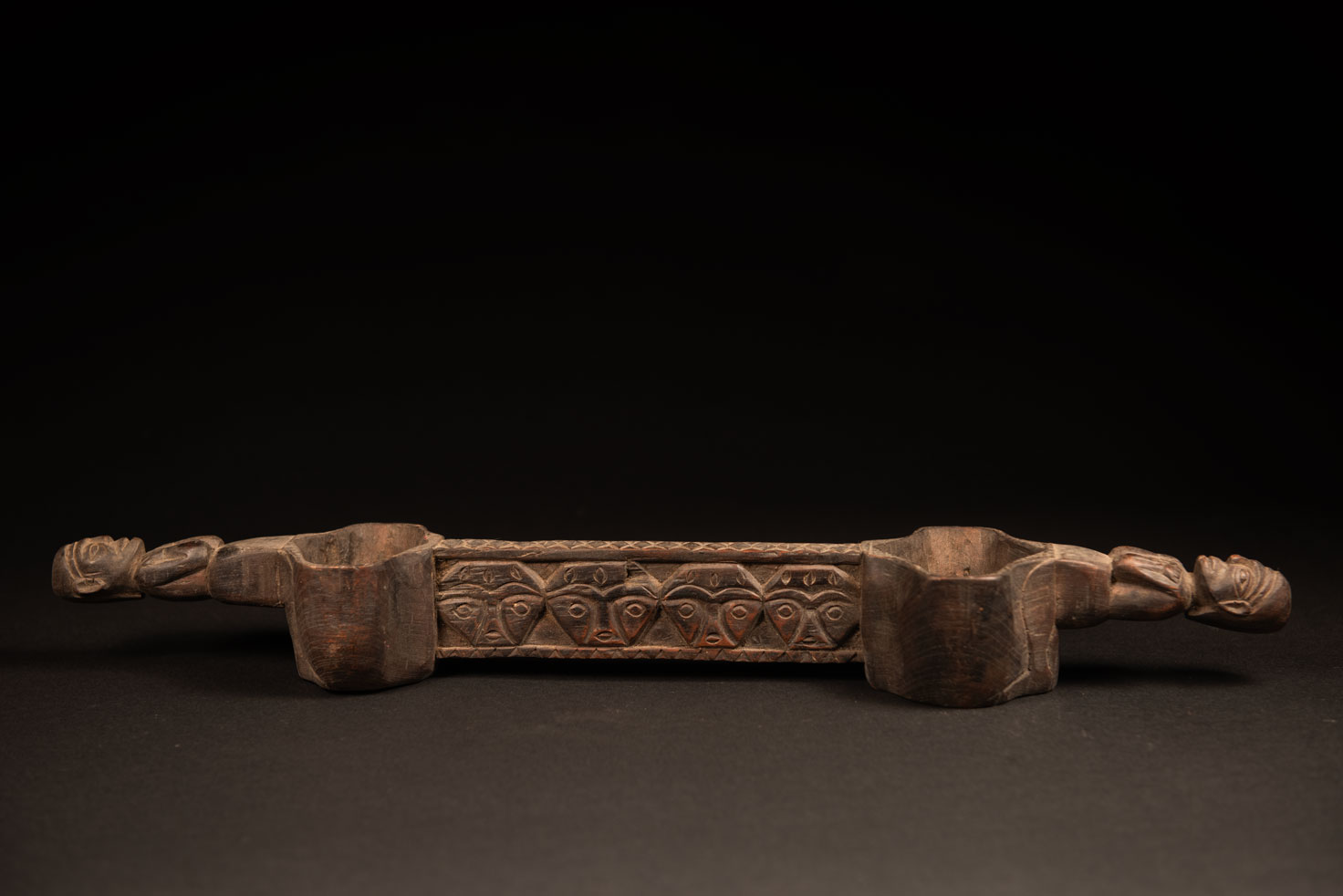 Double Millet Wine Cup The double millet wine cup is an essential accessory for the Paiwan people during ceremonies, weddings, hunting rituals, births, and other important events. To toast, participants crouch side by side, each holding one handle of the cup, and drink together. This double cup is not just an ordinary vessel—it symbolizes the joyful moments of tribal life and the unity of the clan. This model features two beautifully carved handles, each depicting an ancestor holding the drinking cup between his thighs. The center of the double cup is carved with four human faces and a decorative frieze. The entire piece is made of natural wood.