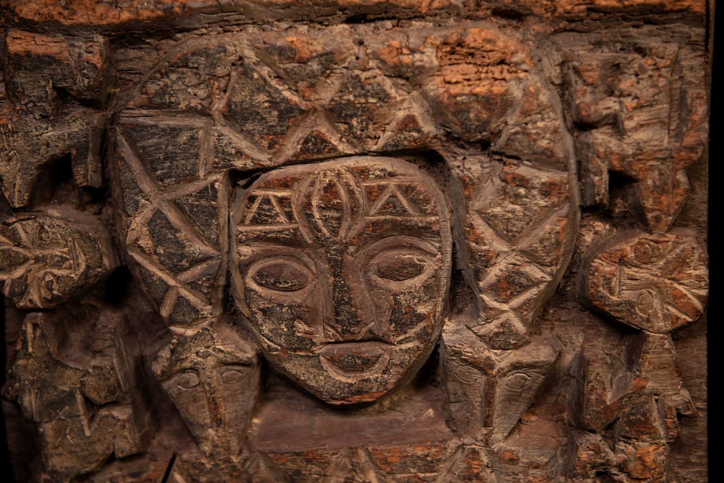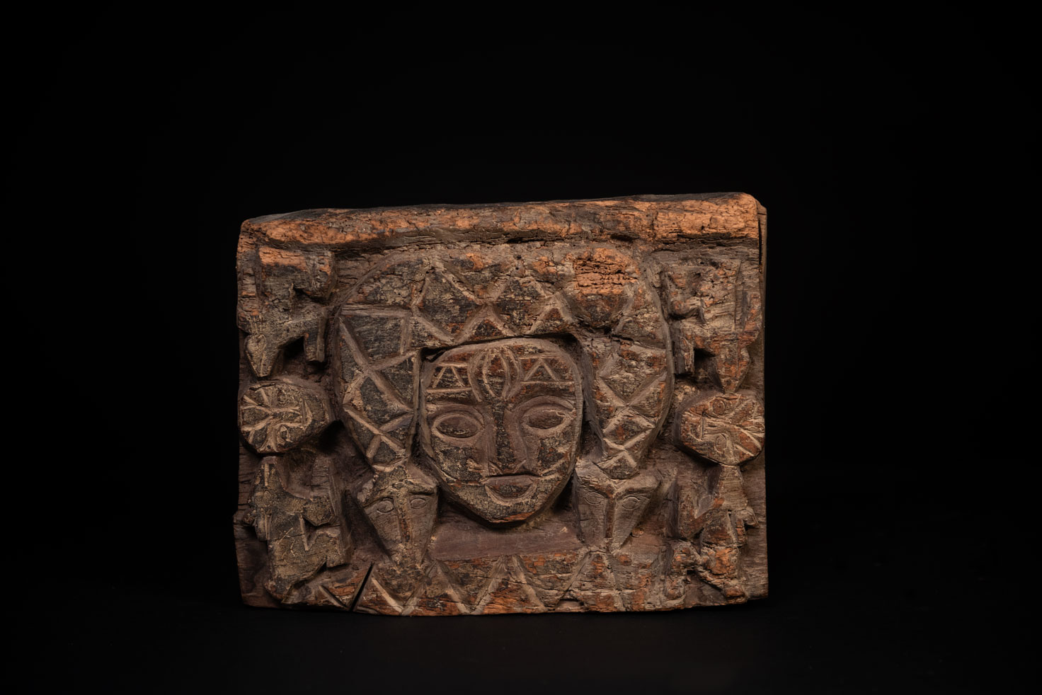 Eave fragment carved with a central face surrounded by a sacred snake, and two faces flanked by deer.