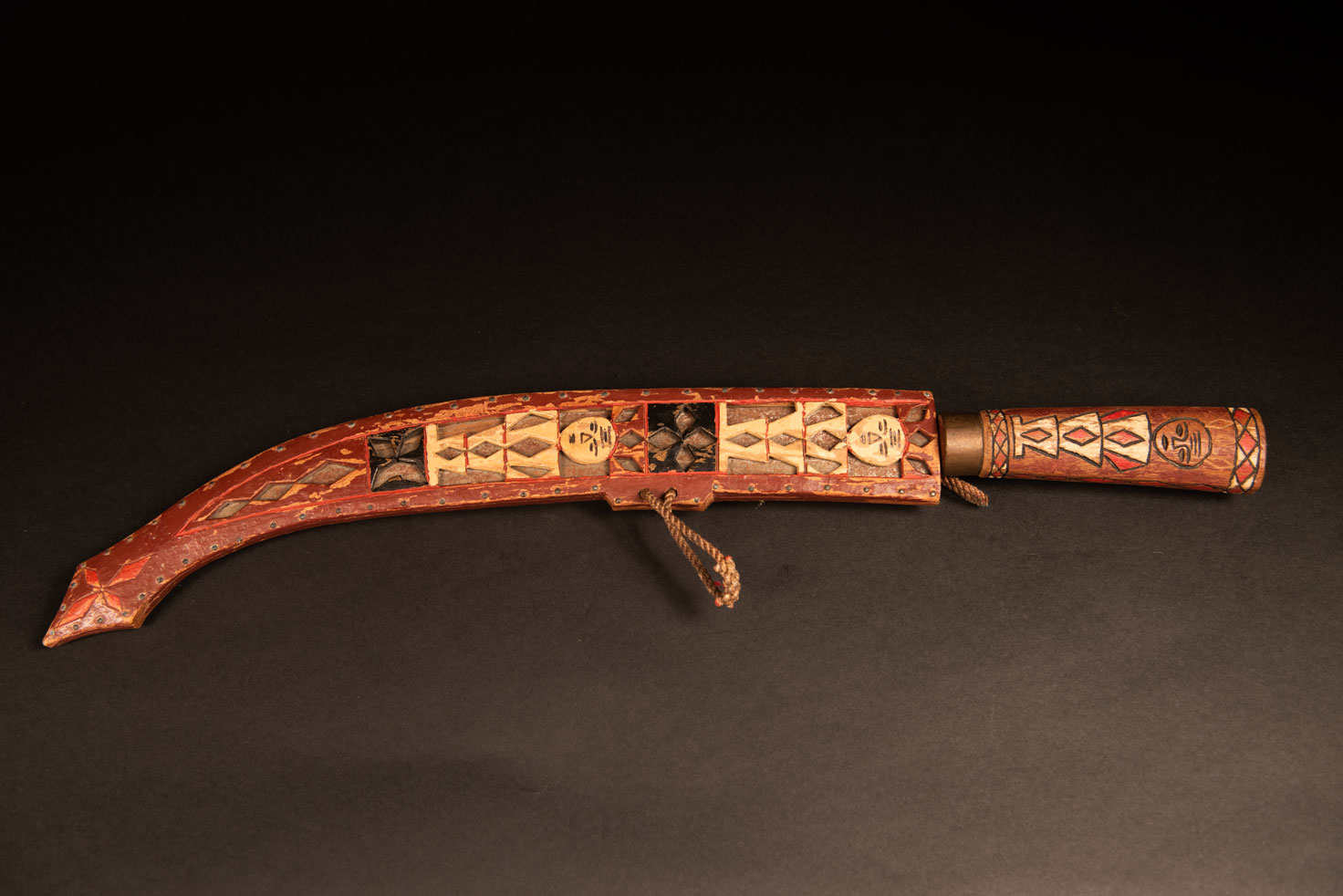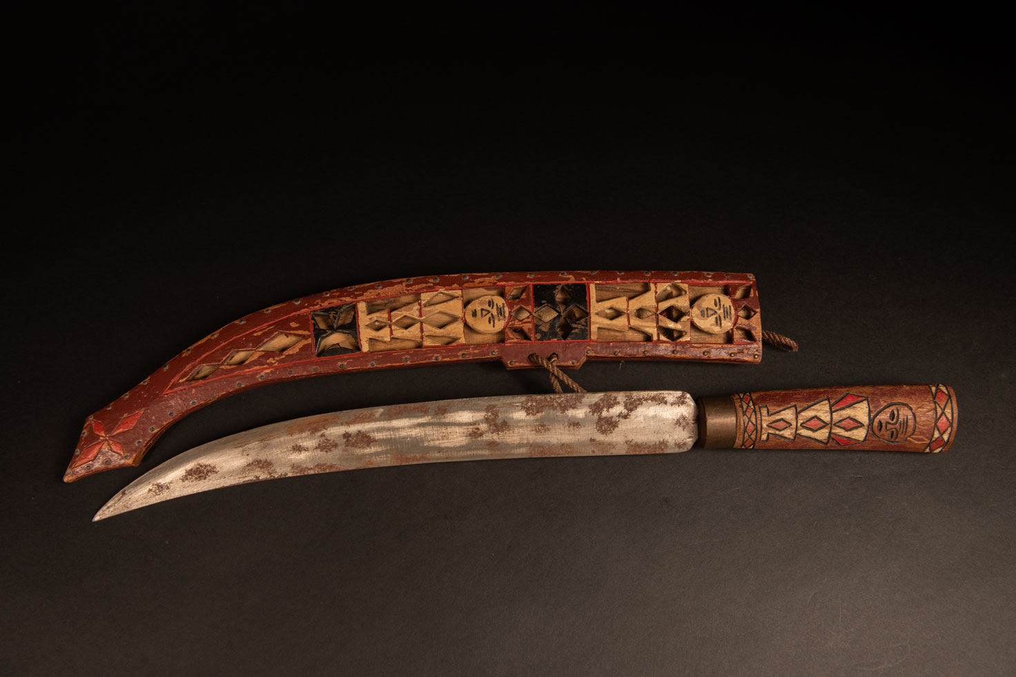 Épée de la tribu Rukai Épée de la tribu Rukai, peinte en rouge, blanc et noir, gravée de motifs de serpents et de personnages humains stylisés. La face avant du fourreau est ajourée, et la lame présente une influence stylistique de la tribu Bunun, voisine des Rukai. Le propriétaire de cette épée a gravé son nom en mandarin sur le manche.