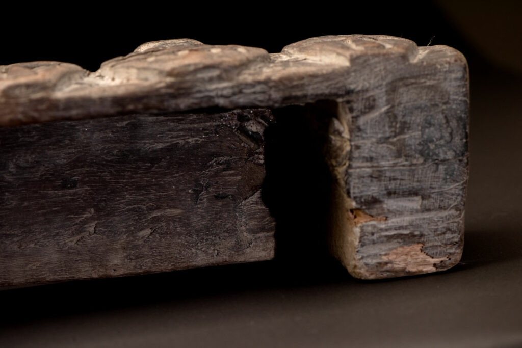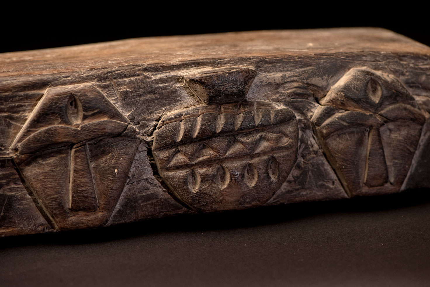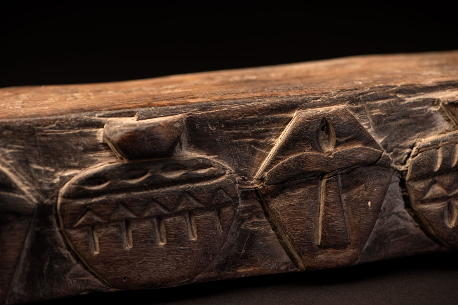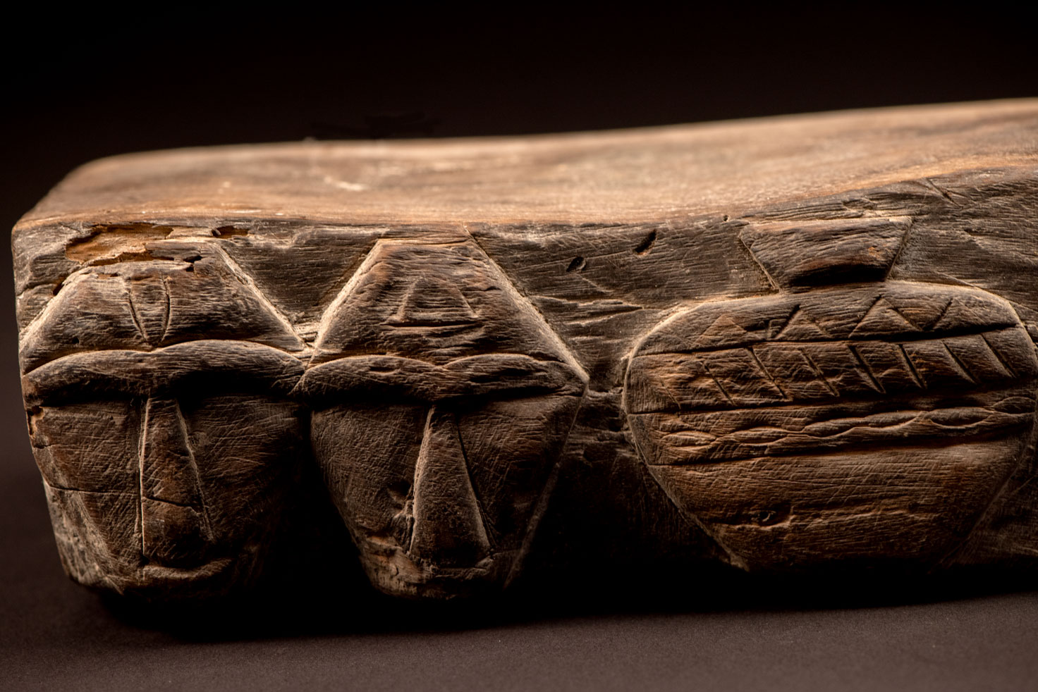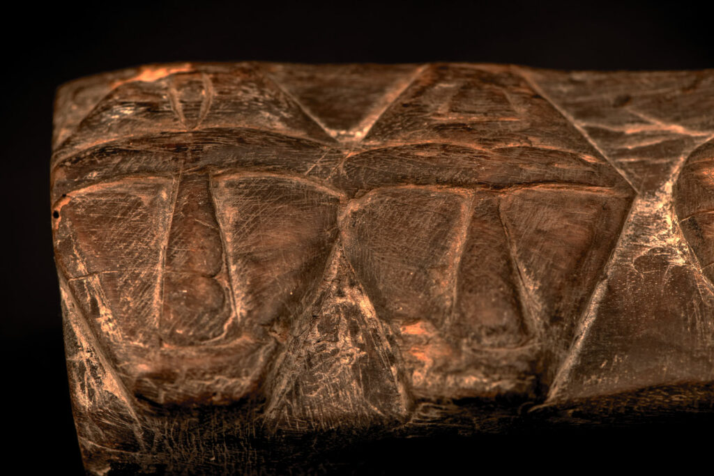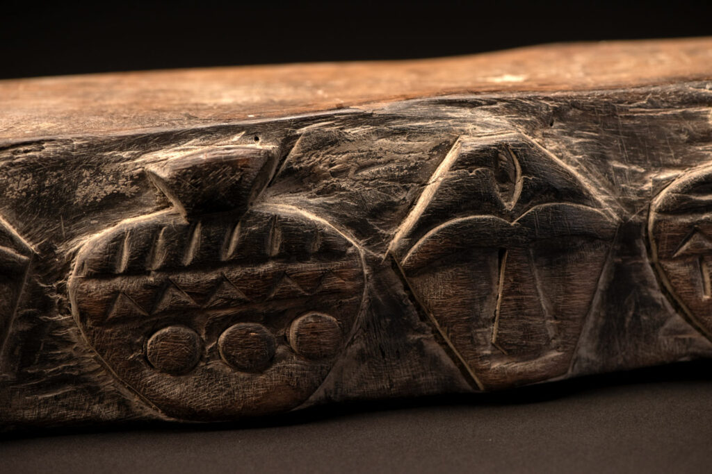 This Rukai tribe headrest is carved with traditional Rukai patterns: the earthenware pot motif, representing ancestors and social status, and the human head motif, symbolizing honor, courage, and warriors.