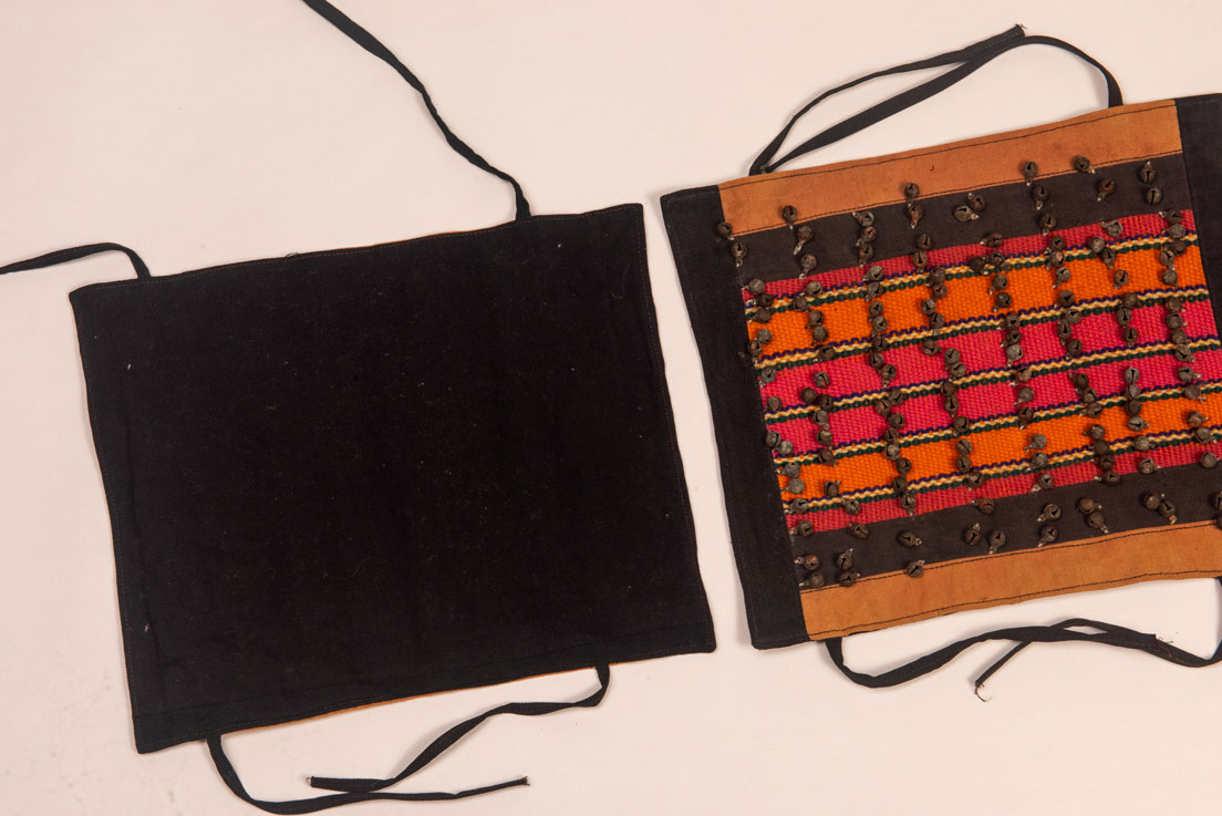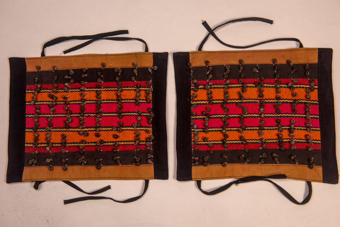 Les femmes de la tribu Paiwan portaient traditionnellement une paire de jambières carrées sur la partie inférieure de leurs longues jupes, laissant les mollets apparents. Des lanières étaient fixées aux extrémités supérieures ou inférieures des jambières, permettant de les attacher solidement autour des mollets. Bien que ce type de vêtement ait pu être porté par des femmes de toutes classes sociales, seules les femmes nobles étaient autorisées à les orner. Les nobles portaient des jambières aux motifs simples pour les occasions informelles, et des modèles plus élaborés pour les tenues cérémonielles. Cette paire de jambières est identique en taille, en motif et en couleur. Principalement confectionnée en tissu de laine rouge, chaque pièce comporte des panneaux rectangulaires en coton noir et orange cousus sur les côtés, ainsi qu’une section rectangulaire centrale sur l’avant. Le tissu est tissé à plat à l’aide de fils de laine rouge, rose, jaune et orange, formant des rayures verticales. Huit rangées de petites clochettes en cuivre sont cousues horizontalement au niveau de la protection du pied, et des lanières en coton noir sont fixées de chaque côté. Lorsqu’elles sont portées, ces lanières sont attachées autour des mollets pour maintenir les jambières bien en place.