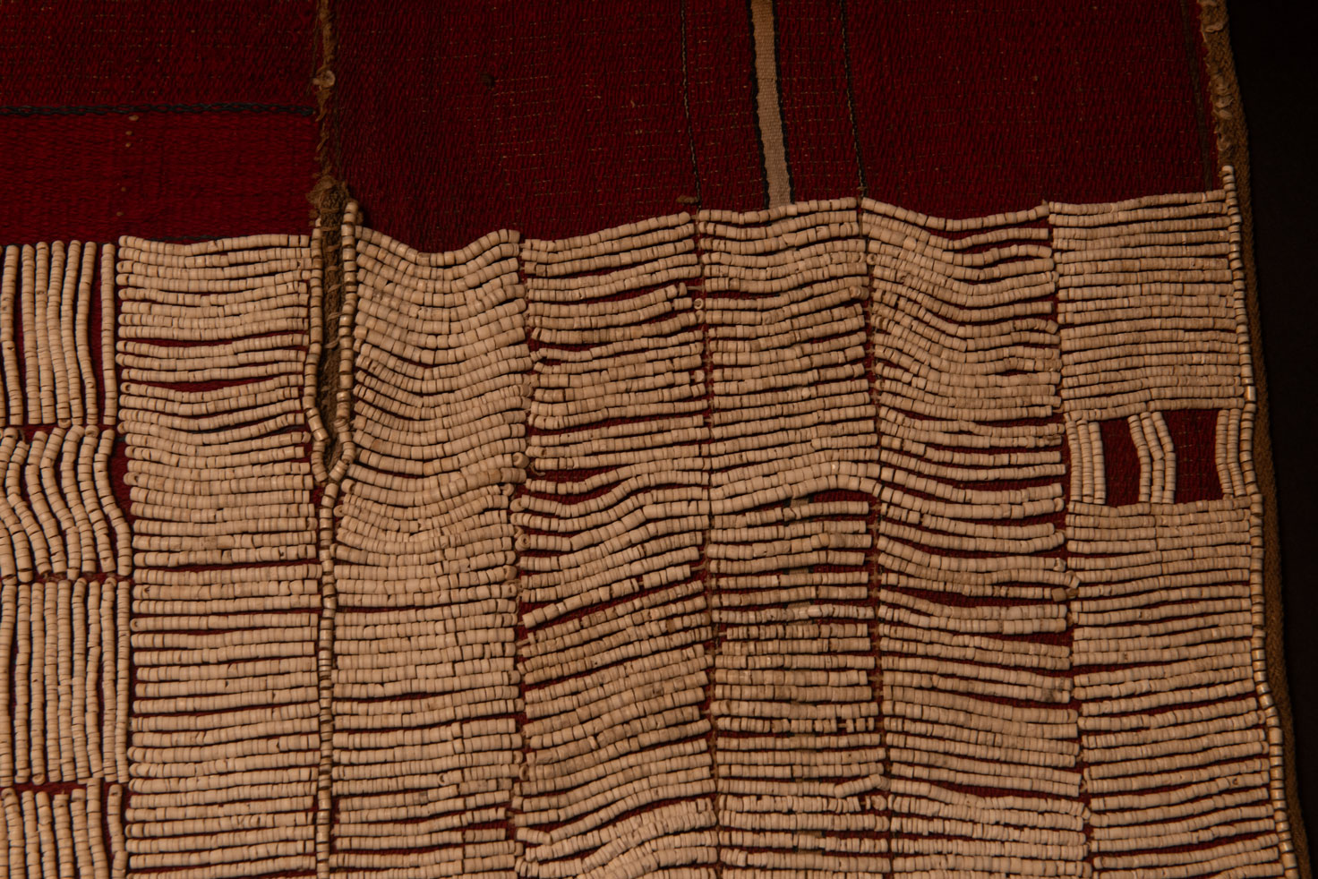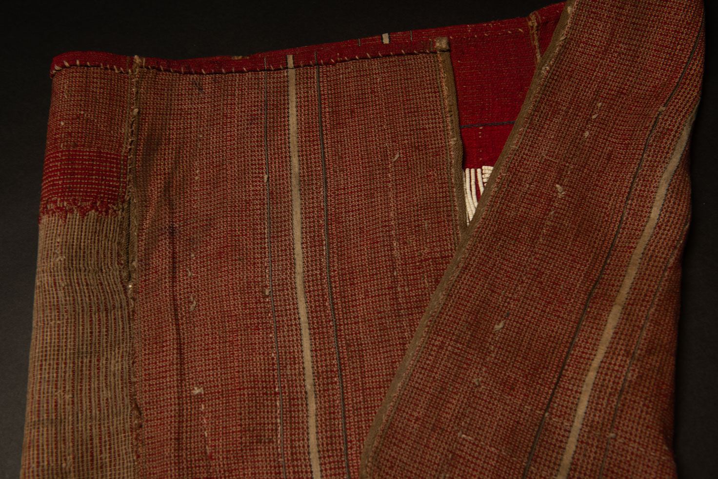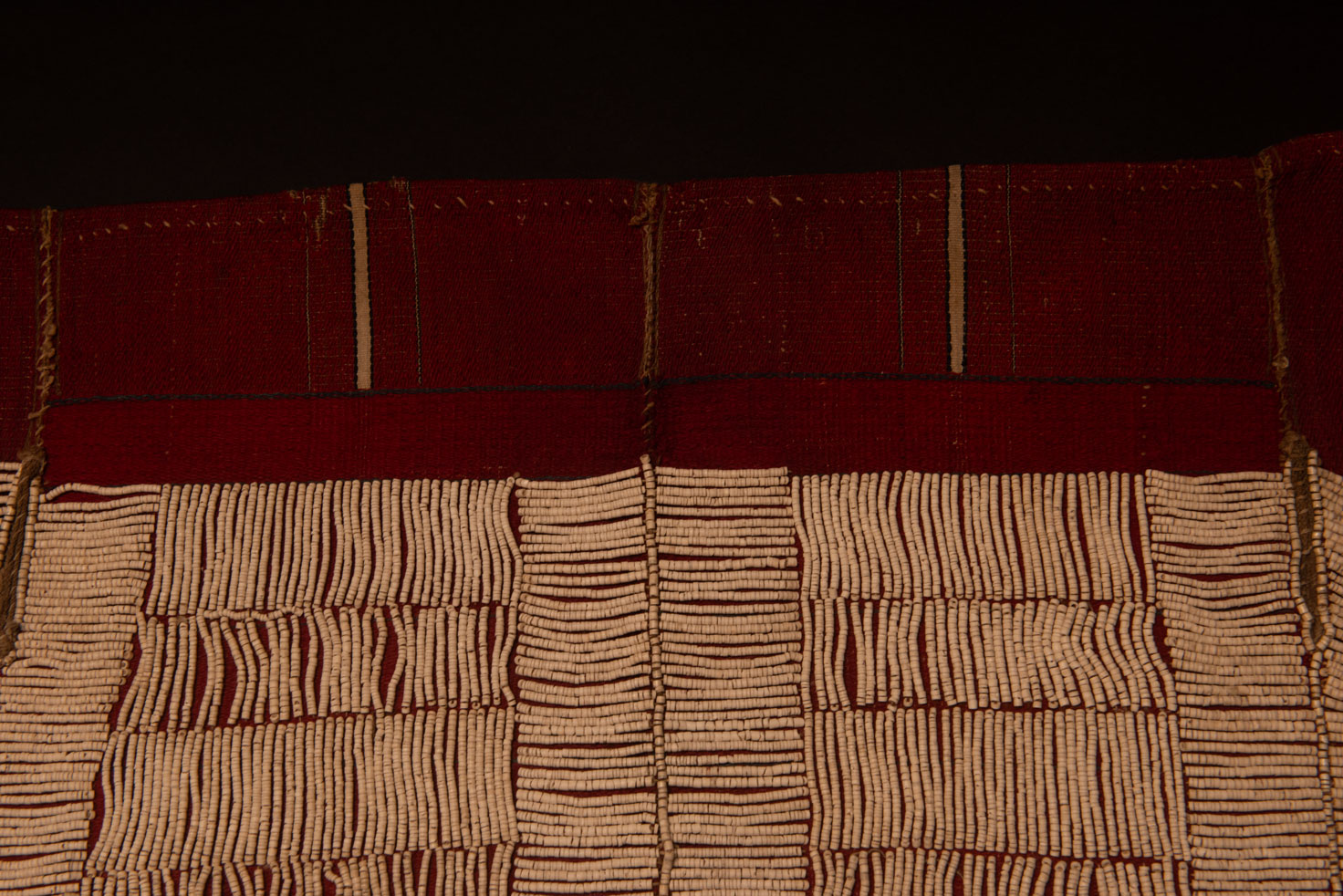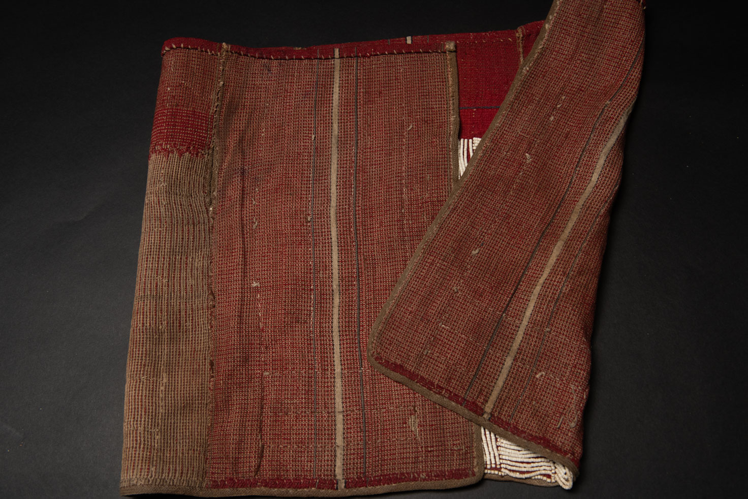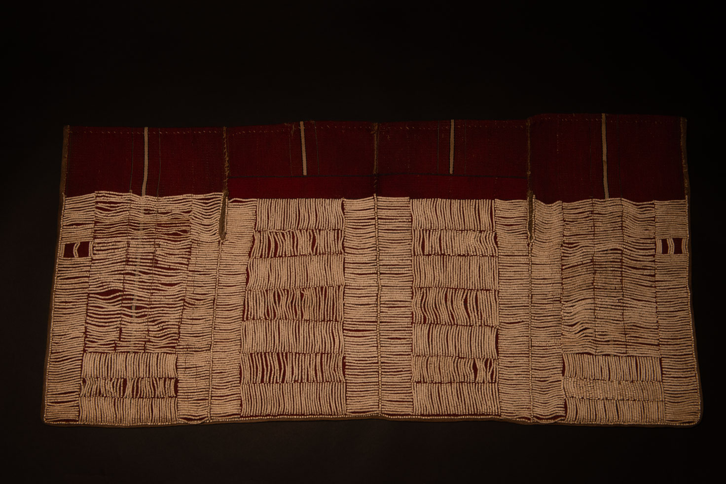 Cette jupe brodée de perles de la tribu Atayal mesure 89 cm de long et 42 cm de large. Elle est tissée en lin et brodée de perles blanches faites a partir d’un coquillage géant. Les motifs sont composés de rayures horizontales et verticales. La partie supérieure (14 cm) n’est pas brodée.