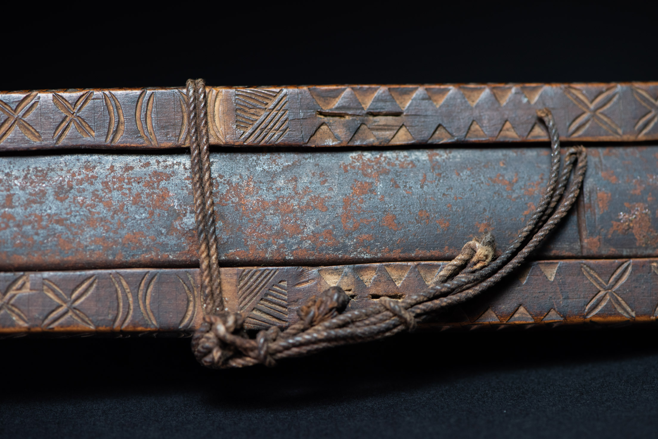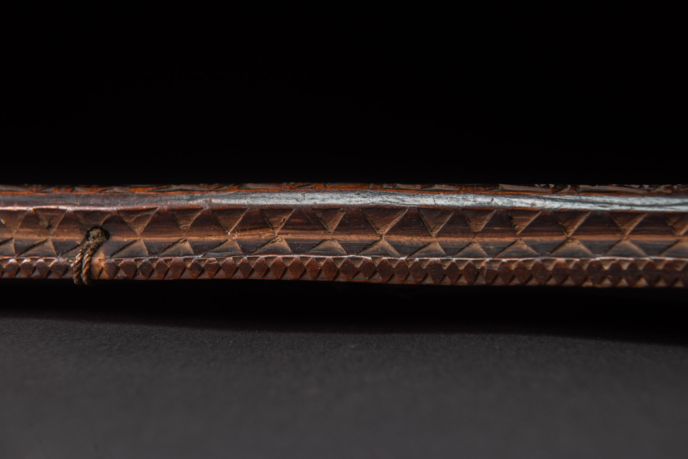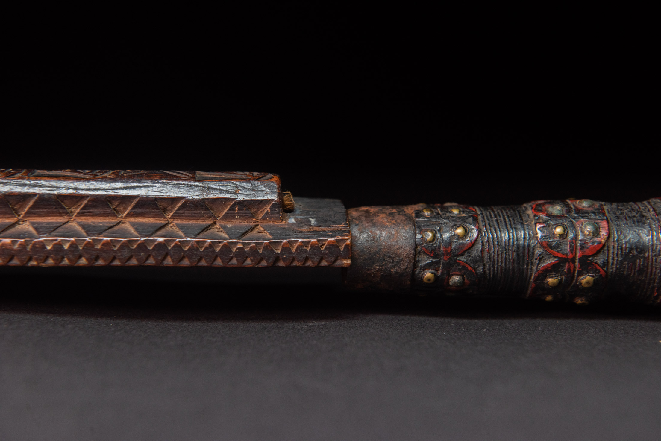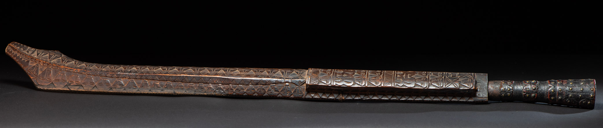 這把非常美麗且罕見的儀式用劍,以南排灣族(Vuculj)典型風格雕刻而成。 劍刃為原件。 正面上緣可見一處專業且年代久遠的修復痕跡。非常精美的作品。