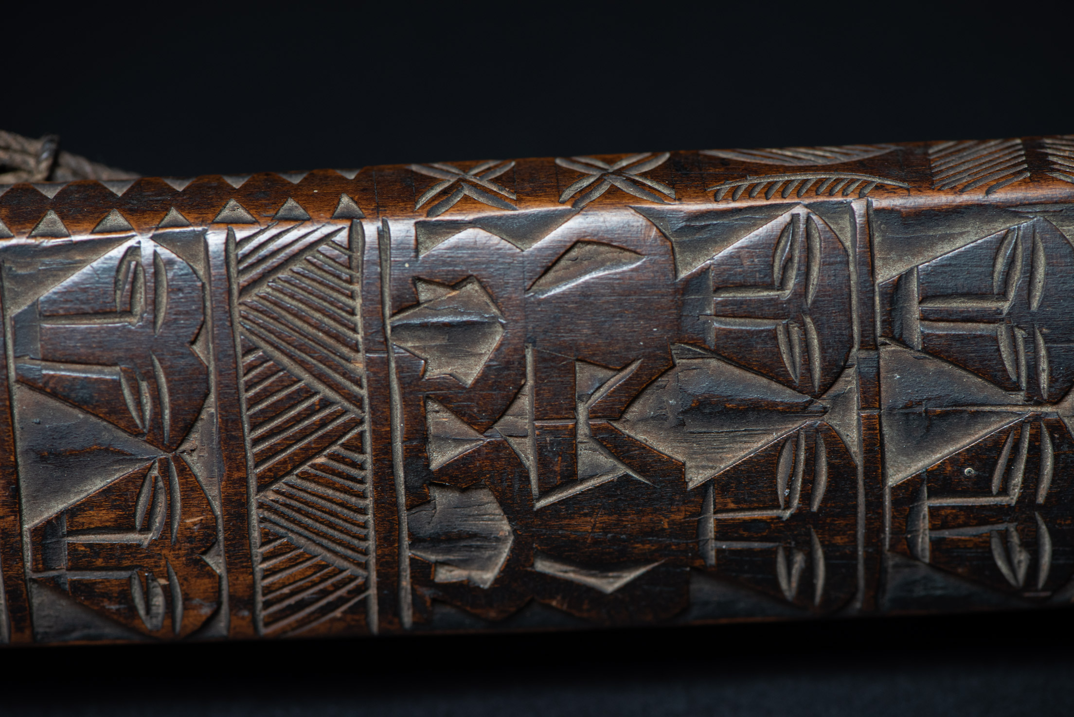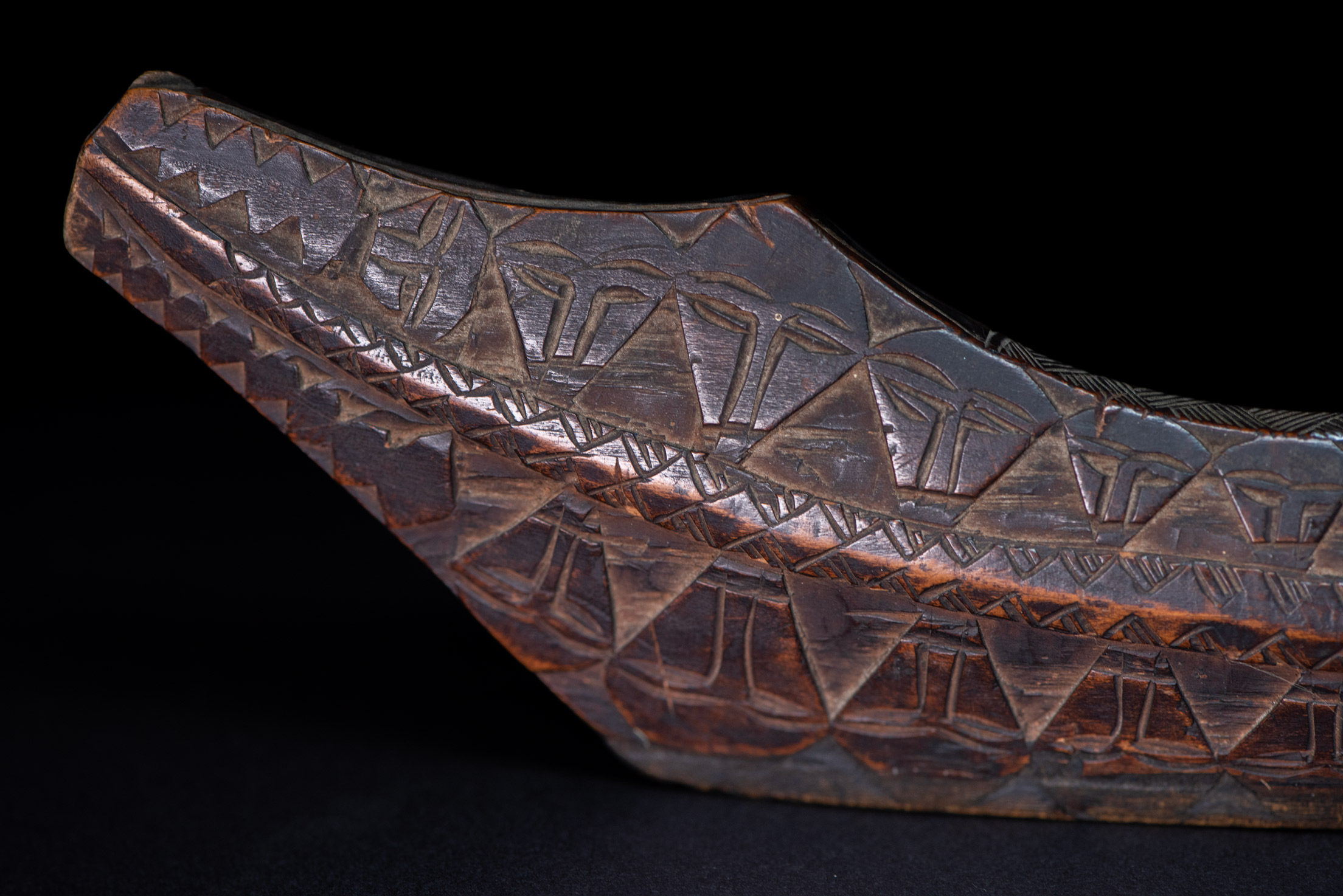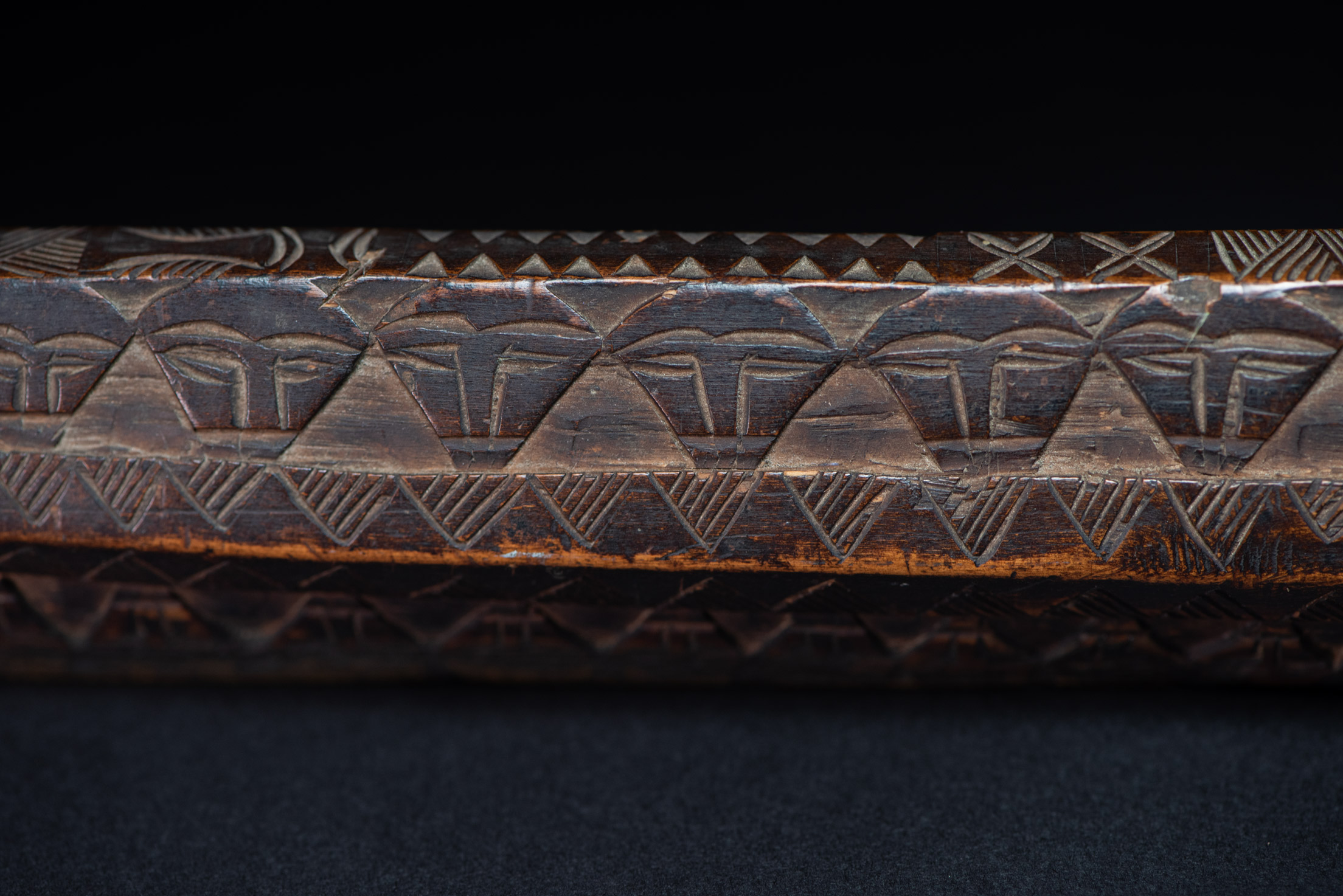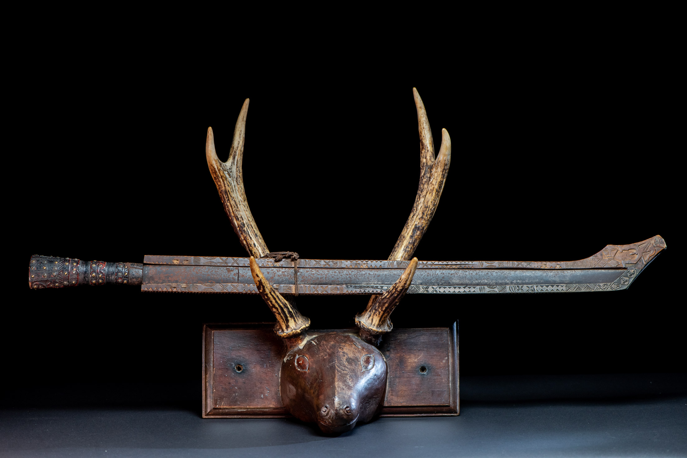這把非常美麗且罕見的儀式用劍,以南排灣族(Vuculj)典型風格雕刻而成。 劍刃為原件。 正面上緣可見一處專業且年代久遠的修復痕跡。非常精美的作品。