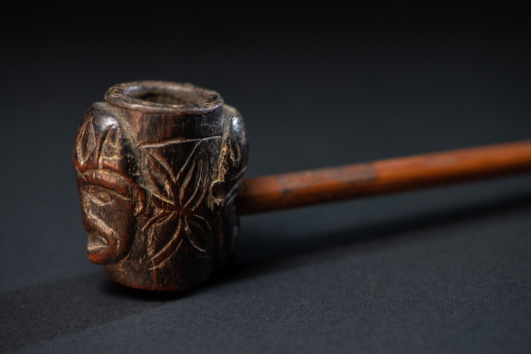 排灣族非常古老且精美的煙斗,以珍貴木材製成,正反兩面皆雕有人臉,象徵排灣戰士。