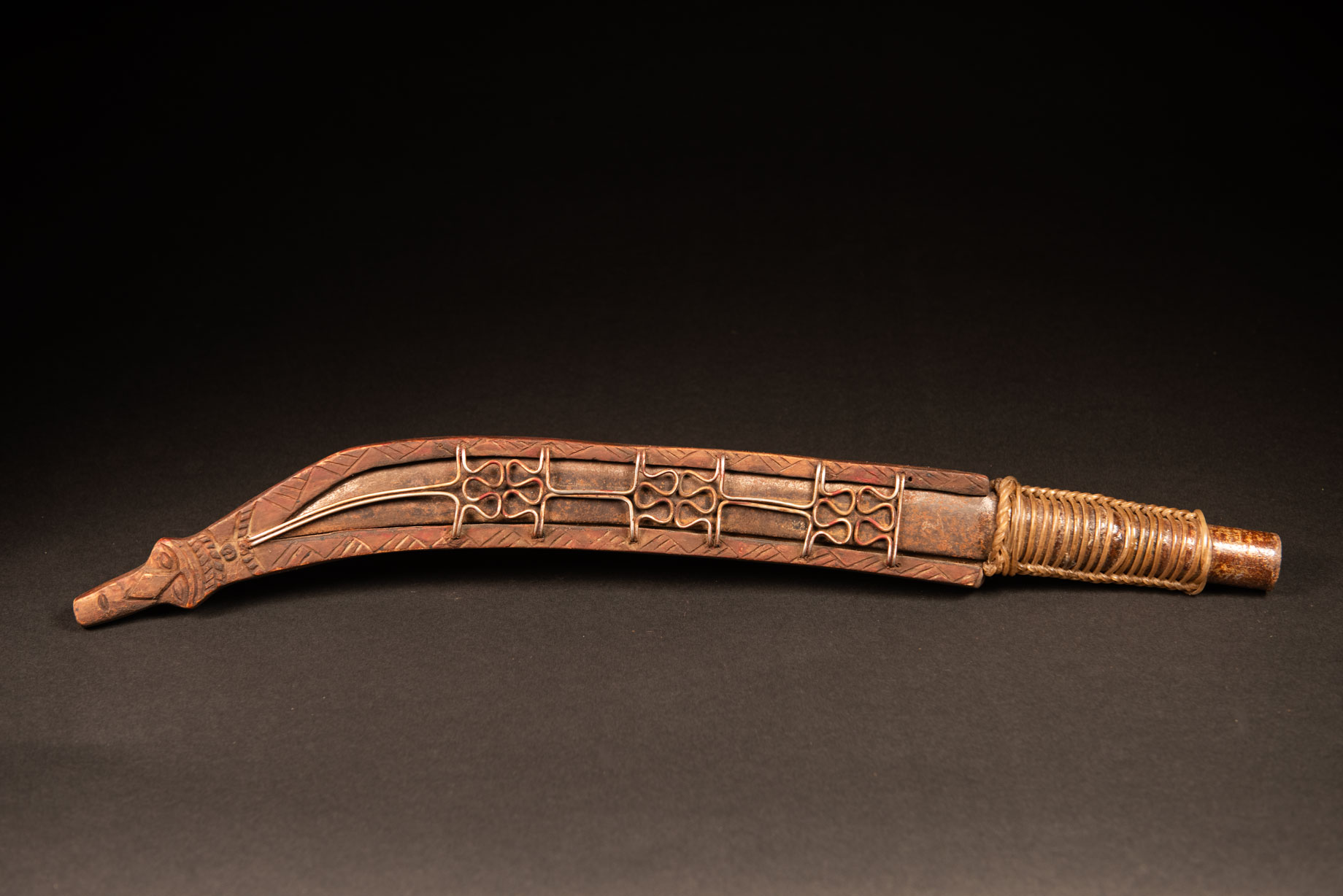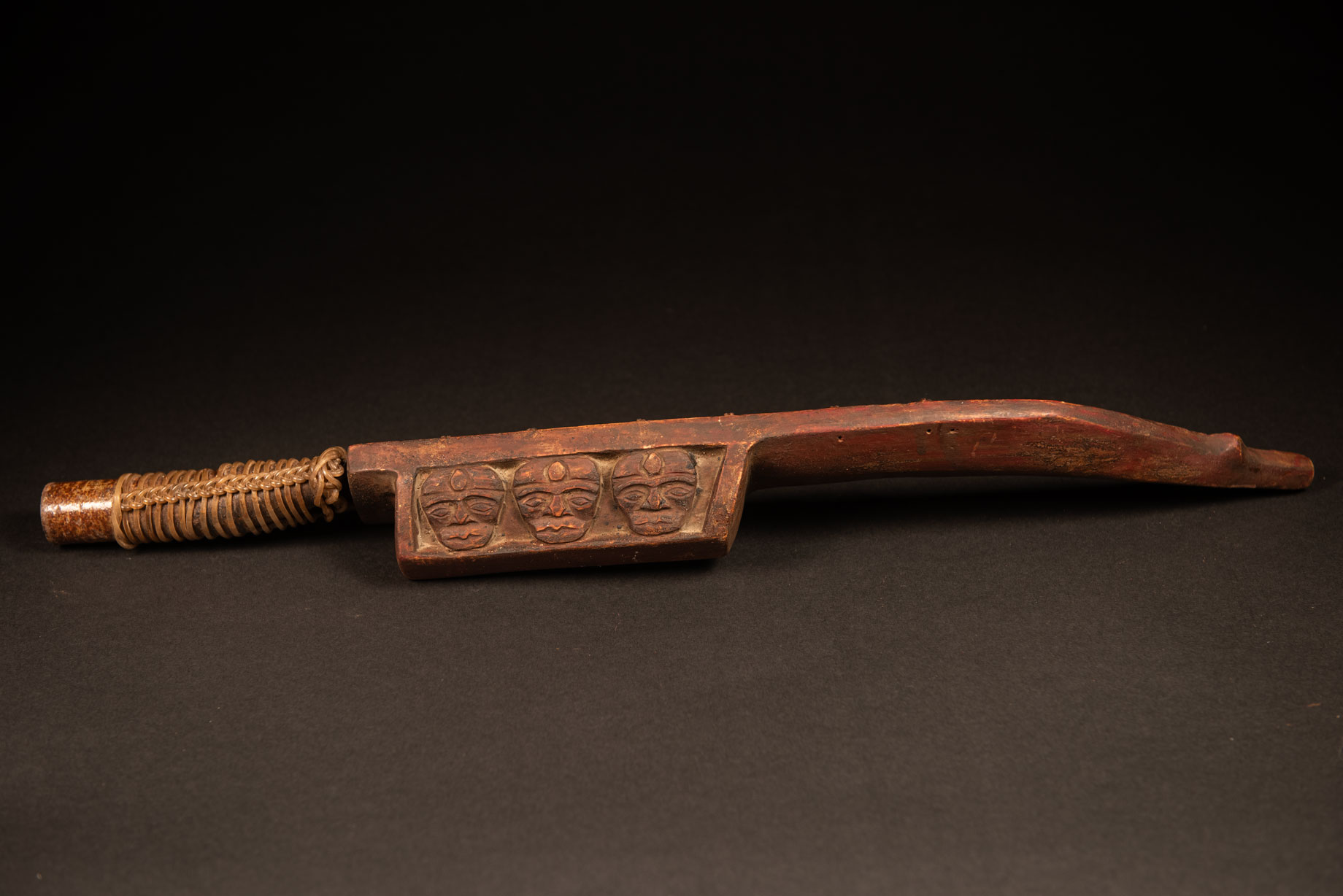 This sword from the Paiwan tribe belonged to a hunter. It is painted brown and simply carved with three human faces on the side. The blade and the handle are made in one piece. The grip is wrapped with braided plastic wire for protection.