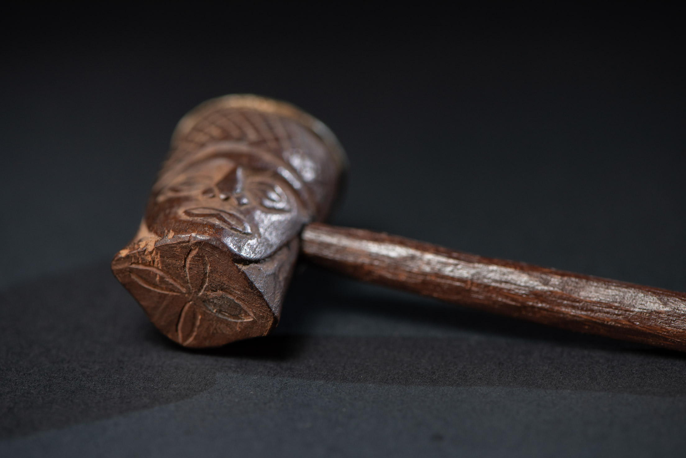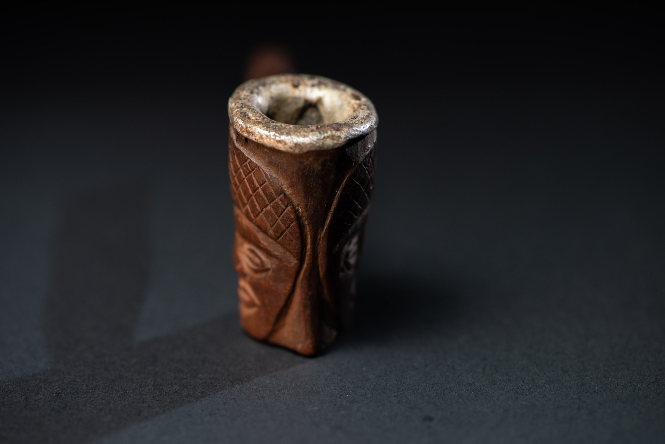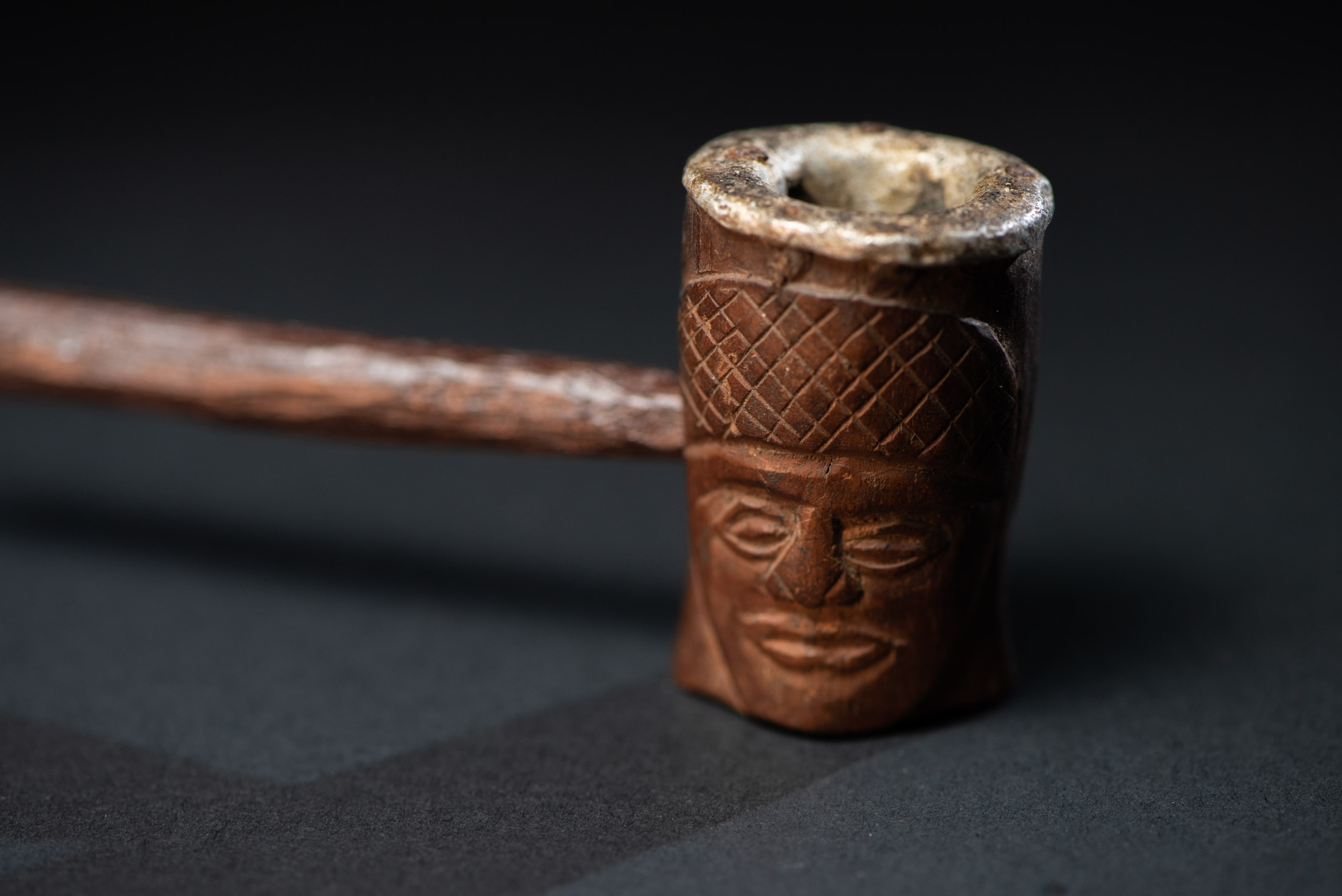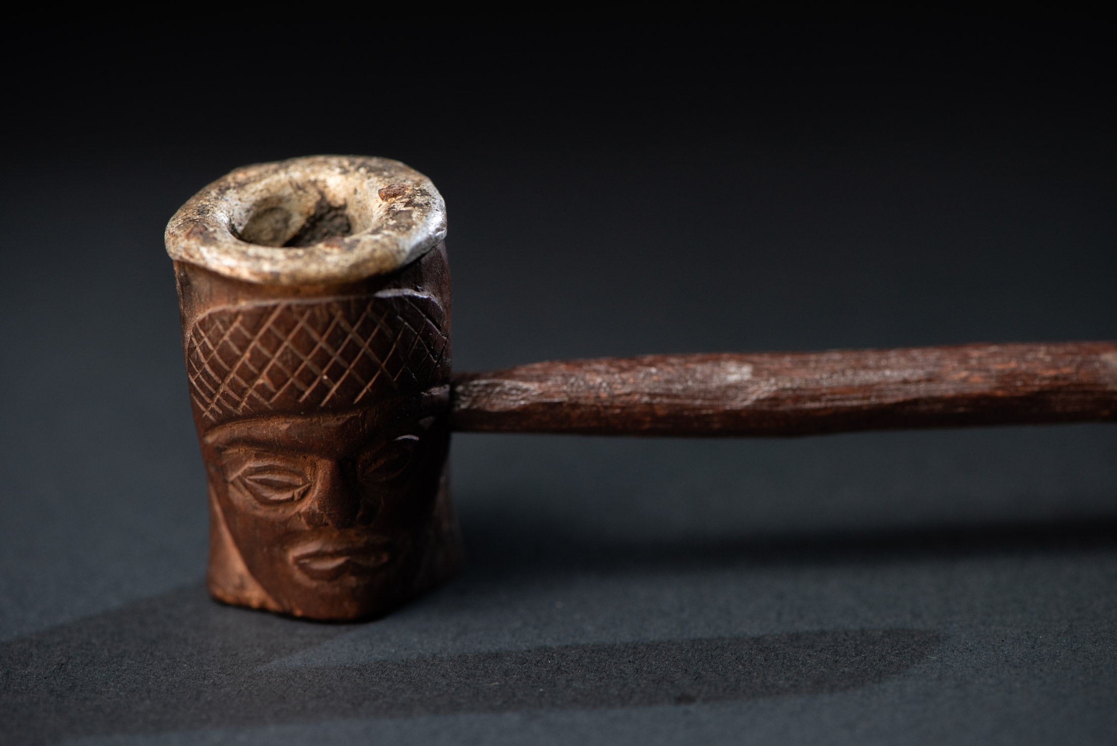 排灣族非常精緻的煙斗,雙面雕刻排灣戰士的人臉。煙斗內部襯有鋁層。