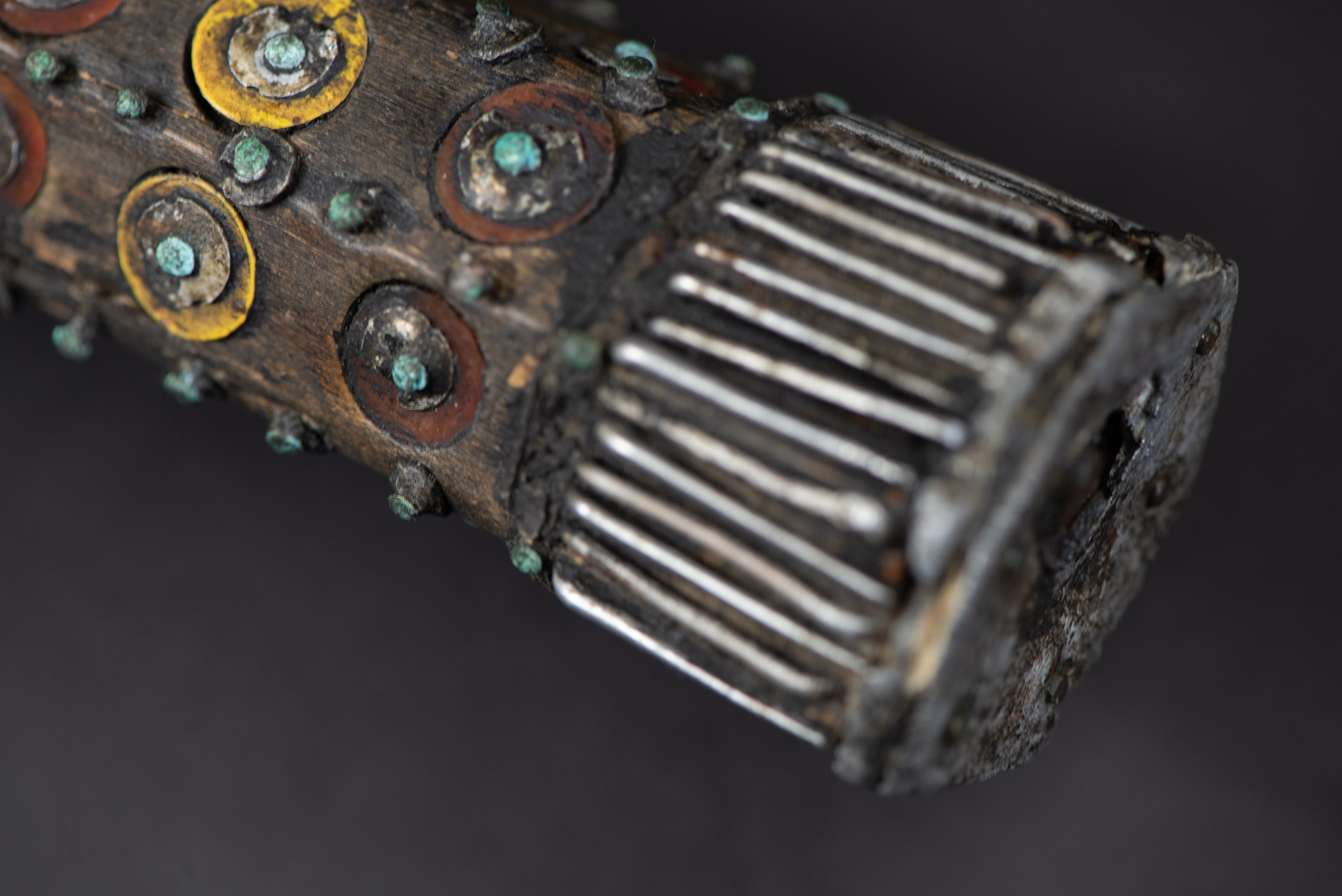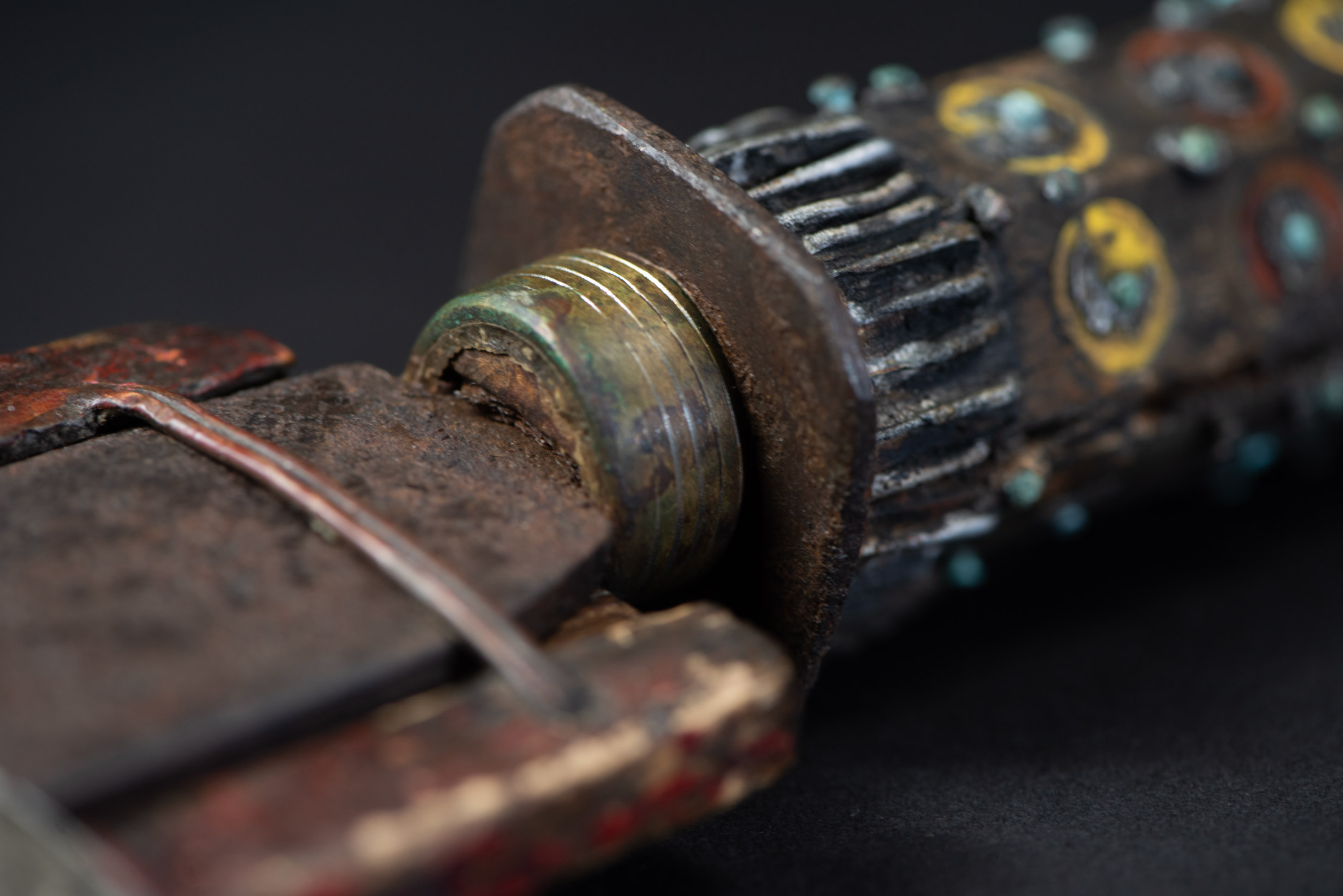 木材、红色颜料、铜