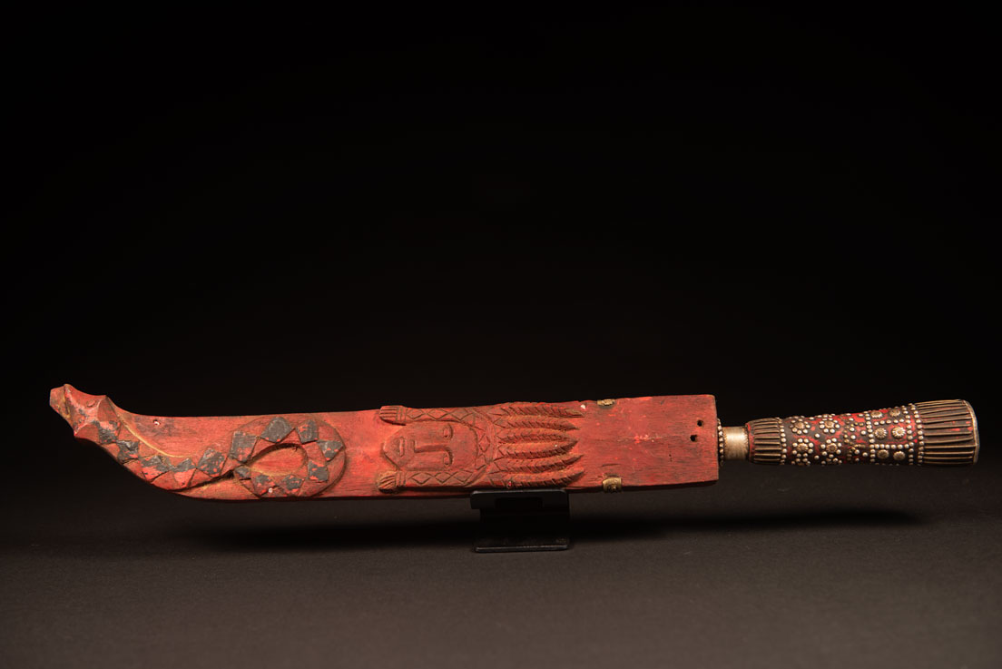 Typical Rukai-style sword with a wooden handle inlaid with steel wire and nail heads. The straight blade is long, and the red scabbard ends by a face snake done with iron . the back of the scabbard is carved with a snake and human face .