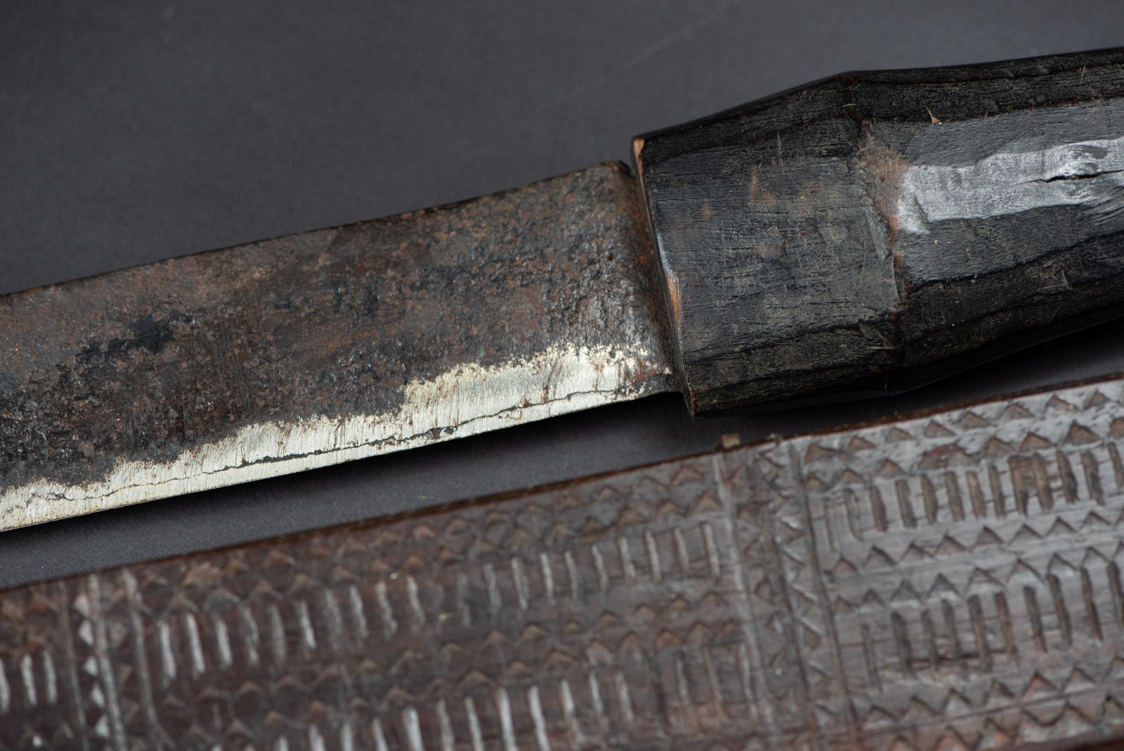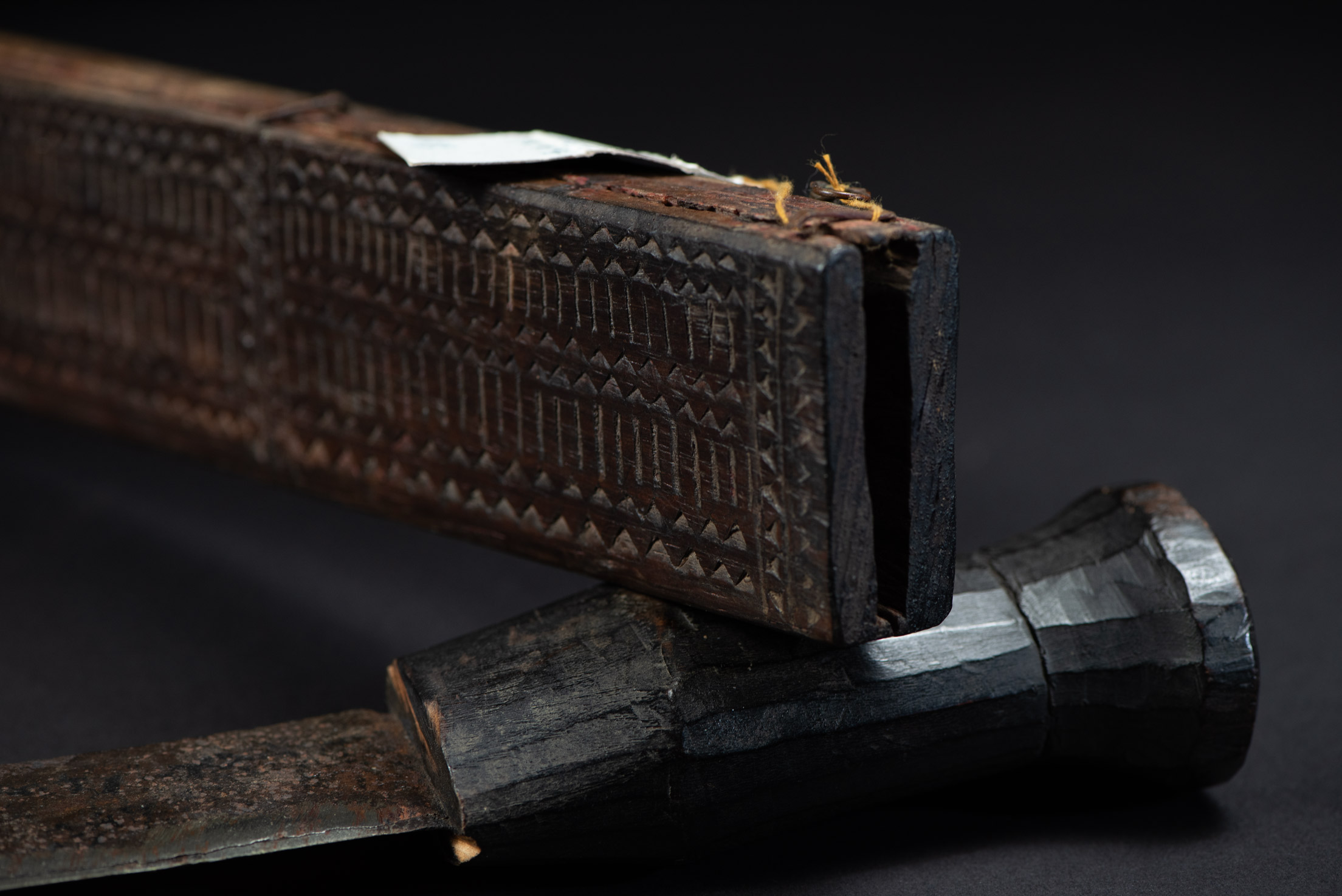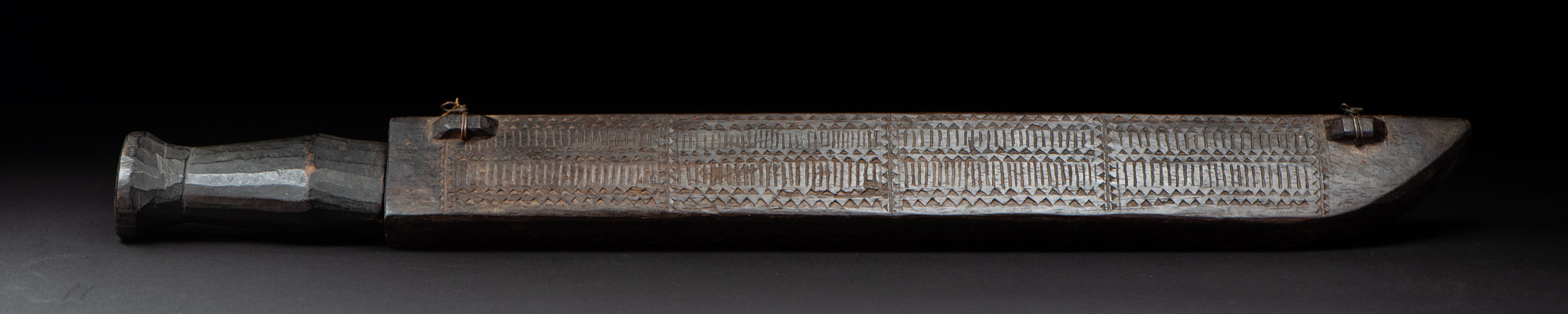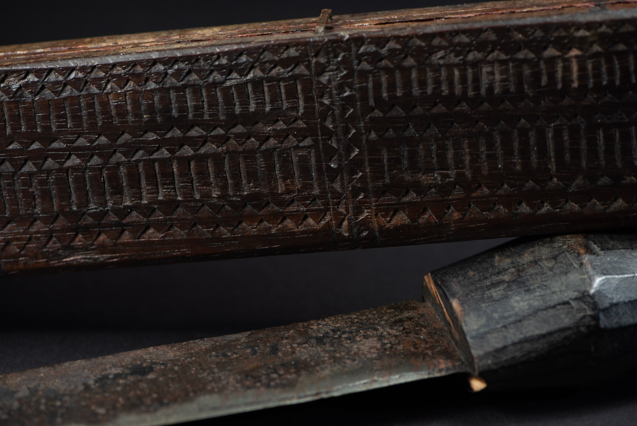This sword, known as Pararowai, originates from the Yami tribe of Orchid Island (also called Botel Tobago). Intricately carved with traditional Yami tribal motifs, it is one of the three distinctive types of knives used by the Yami people. A unique feature of this style is the partially split front edge of the sheath, which reveals the tip of the curved blade. The Pararowai serves both ritualistic and practical functions—it is used to ward off evil spirits and also as a meat cleaver.