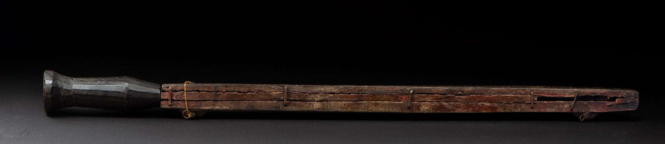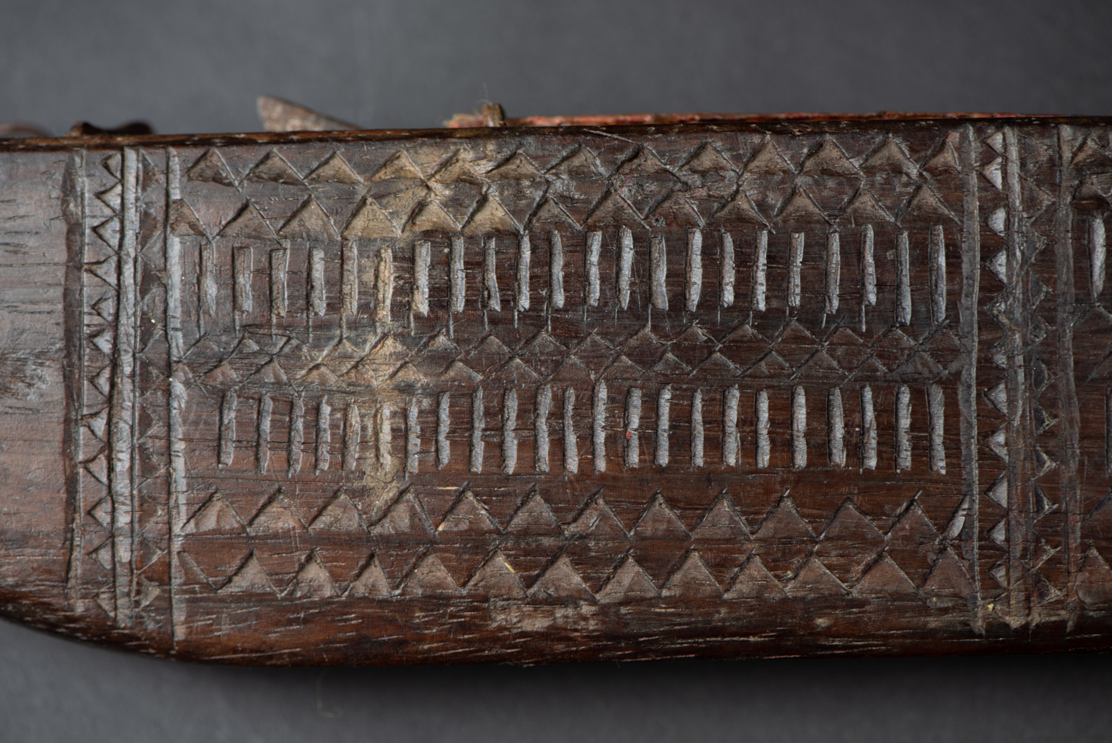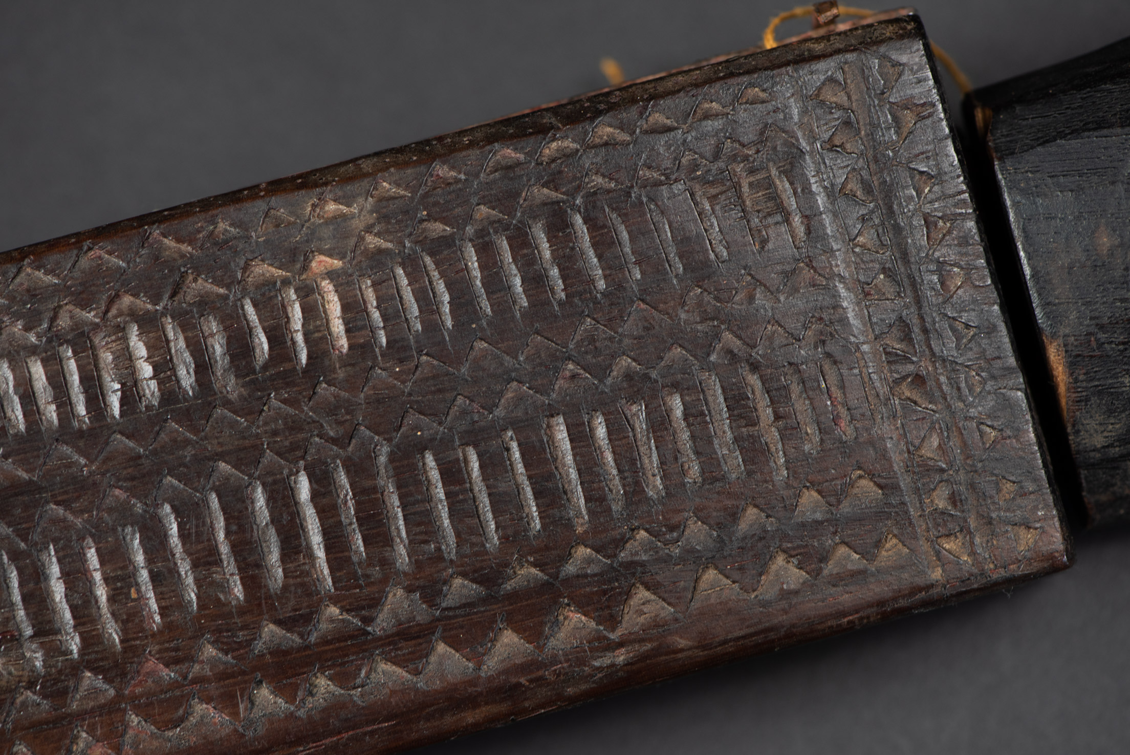 This sword, known as Pararowai, originates from the Yami tribe of Orchid Island (also called Botel Tobago). Intricately carved with traditional Yami tribal motifs, it is one of the three distinctive types of knives used by the Yami people. A unique feature of this style is the partially split front edge of the sheath, which reveals the tip of the curved blade. The Pararowai serves both ritualistic and practical functions—it is used to ward off evil spirits and also as a meat cleaver.
